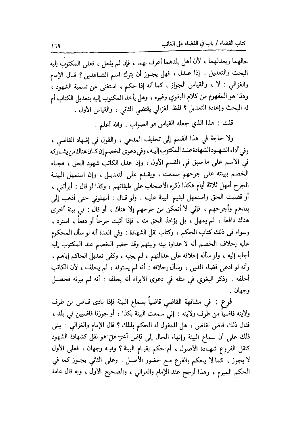 حالهما ويعدلهما، لان أهل بلدهما أعرف بهما، فإن لم يفعل، فعلى المكتوب إليه البحث والتعديل. إذا عدل، فهل يجوز أن يترك اسم الشاهدين ؟ قال الامام والغزالي: لا، والقياس الجواز، كما أنه إذا حكم، استغنى عن تسمية الشهود، وهذا هو المفهوم من كلام البغوي وغيره، وهل يأخذ المكتوب إليه بتعديل الكتاب أم له البحث وإعادة التعديل ؟ لفظ الغزالي يقتضي الثاني، والقياس الاول. قلت: هذا الذي جعله القياس هو الصواب. والله أعلم. ولا حاجة في هذا القسم إلى تحليف المدعي، والقول في إشهاد القاضي، وفي أداء الشهود الشهادة عند المكتوب إليه وفي دعوى الخصم إن كان هناك من يشاركه في الاسم على ما سبق في القسم الاول، وإذا عدل الكاتب شهود الحق، فجاء الخصم ببينته على جرحهم سمعت، ويقدم على التعديل، وإن استمهل البينة الجرح أمهل ثلاثة أيام هكذا ذكره الاصحاب على طبقاتهم، وكذا لو قال: أبرأتني، أو قضيت الحق واستمهل ليقيم البينة عليه. ولو قال: أمهلوني حتى أذهب إلى بلدهم وأجرحهم، فإني لا أتمكن من جرحهم إلا هناك، أو قال: لي بينة أخرى هناك دافعة، لم يمهل، بل يؤخذ الحق منه، فإذا أثبت جرحا أدفعا، استرد، وسواء في ذلك كتاب الحكم، وكتاب نقل الشهادة: وفي العدة أنه لو سأله المحكوم عليه إحلاف الخصم أنه لا عداوة بينه وبينهم وقد حضر الخصم عند المكتوب إليه أجابه إليه، ولو سأل إحلافه على عدالتهم، لم يجبه، وكفى تعديل الحاكم إياهم، وأنه لو ادعى قضاء الدين، وسأل إحلافه: أنه لم يستوفه، لم يحلف، لان الكاتب أحلفه. وذكر البغوي في مثله في دعوى الابراء أنه يحلفه: أنه لم يبرئه فحصل وجهان. فرع في مشافهة القاضي قاضيا بسماع البينة فإذا نادى قاض من طرف ولايته قاضيا من طرف ولايته: إني سمعت البينة بكذا، أو جوزنا قاضيين في بلد، فقال ذلك قاض لقاض، هل للمقول له الحكم بذلك ؟ قال الامام والغزالي: يبنى ذلك على أن سماع البينة وإنهاء الحال إلى قاض آخر هل هو نقل كشهادة الشهود كنقل الفروع شهادة الاصول، أم حكم بقيام البينة ؟ وفيه وجهان، فعلى الاول لا يجوز، كما لا يحكم بالفرع مع حضور الاصل. وعلى الثاني يجوز كما في الحكم المبرم، وهذا أرجح عند الامام والغزالي، والصحيح الاول، وبه قال عامة