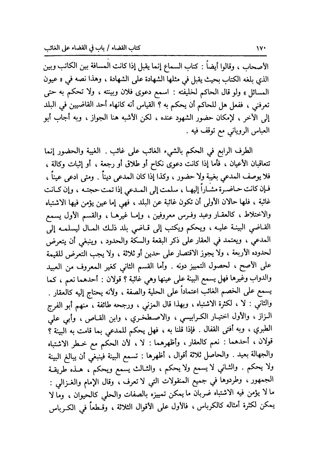 الطرف الرابع : في الحكم بالشئ الغائب على غائب. الغيبة والحضور إنما تتعاقبان الاعيان، فأما إذا كانت دعوى نكاح أو طلاق أو رجعة، أو إثبات وكالة، فلا يوصف المدعي بغيبة ولا حضور، وكذا إذا كان المدعى دينا. ومتى ادعى عينا، فإن كانت حاضرة مشارا إليها، سلمت إلى المدعي إذا تمت حجته، وإن كانت غائبة، فلها حالان الاولى أن تكون غائبة عن البلد، فهي إما عين يؤمن فيها الاشتباه والاختلاط، كالعقار وعبد وفرس معروفين، وإما غيرها، والقسم الاول يسمع القاضي البينة عليه، ويحكم ويكتب إلى قاضي بلد ذلك المال ليسلمه إلى المدعي، ويعتمد في العقار على ذكر البقعة والسكة والحدود، وينبغي أن يتعرض لحدوده الاربعة، ولا يجوز الاقتصار على حدين أو ثلاثة، ولا يجب التعرض للقيمة على الاصح، لحصول التمييز دونه. وأما القسم الثاني كغير المعروف من المعروف من العبيد والدواب وغيرها فهل يسمع البينة على عينها وهي غائبة ؟ قولان: أحدهما نعم، كما يسمع على الخصم الغائب اعتمادا على الحلية والصفة، ولانه يحتاج إليه كالعقار. والثاني: لا، لكثرة الاشتباه، وبهذا قال المزني، ورجحه طائفة، منهم أبو الفرج الزاز، والاول اختيار الكرابيسي، والاصطخري، وابن القاص، وأبي علي الطبري، وبه أفتى القفال. فإذا قلنا به، فهل يحكم للمدعي بما قامت به البينة ؟ قولان، أحدهما: نعم كالعقار، وأظهرهما: لا، لان الحكم مع خطر الاشتباه والجهالة بعيد. والحاصل ثلاثة أقوال، أظهرها: تسمع البينة فينبغي أن يبالغ البينة ولا يحكم، والثاني لا يسمع ولا يحكم، والثالث يسمع ويحكم، هذه طريقة الجمهور، وطردوها في جميع المنقولات التي لا تعرف، وقال الامام والغزالي: ما لا يؤمن فيه الاشتباه ضربان ما يمكن تمييزه بالصفات والحلي كالحيوان، وما لا يمكن لكثرة أمثاله كالكرباس، فالاول على الاقوال الثلاثة، وقطعا في الكرباس