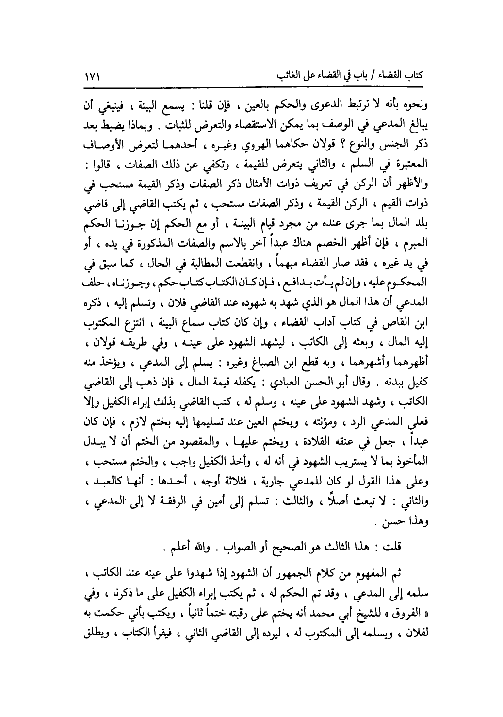 ونحوه بأنه لا ترتبط الدعوى والحكم بالعين، فإن قلنا: يسمع البينة، فينبغي أن يبالغ المدعي في الوصف بما يمكن الاستقصاء والتعرض للثبات. وبماذا يضبط بعد ذكر الجنس والنوع ؟ قولان حكاهما الهروي وغيره، أحدهما لتعرض الاوصاف المعتبرة في السلم، والثاني يتعرض للقيمة، وتكفي عن ذلك الصفات، قالوا: والاظهر أن الركن في تعريف ذوات الامثال ذكر الصفات وذكر القيمة مستحب في ذوات القيم، الركن القيمة، وذكر الصفات مستحب، ثم يكتب القاضي إلى قاضي بلد المال بما جرى عنده من مجرد قيام البينة، أو مع الحكم إن جوزنا الحكم المبرم، فإن أظهر الخصم هناك عبدا آخر بالاسم والصفات المذكورة في يده، أو في يد غيره، فقد صار القضاء مبهما، وانقطعت المطالبة في الحال، كما سبق في المحكوم عليه، وإن لم يأت بدافع، فإن كان الكتاب كتاب حكم، وجوزناه، حلف المدعي أن هذا المال هو الذي شهد به شهوده عند القاضي فلان، وتسلم إليه، ذكره ابن القاص في كتاب آداب القضاء، وإن كان كتاب سماع البينة، انتزع المكتوب إليه المال، وبعثه إلى الكاتب، ليشهد الشهود على عينه، وفي طريقه قولان، أظهرهما وأشهرهما، وبه قطع ابن الصباغ وغيره: يسلم إلى المدعي، ويؤخذ منه كفيل ببدنه. وقال أبو الحسن العبادي: يكفله قيمة المال، فإن ذهب إلى القاضي الكاتب، وشهد الشهود على عينه، وسلم به، كتب القاضي بذلك إبراء الكفيل وإلا فعلى المدعي الرد، ومؤنته، ويختم العين عند تسليمها إليه بختم لازم، فإن كان عبدا، جعل في عنقه القلادة، ويختم عليها، والمقصود من الختم أن لا يبدل المأخوذ بما لا يستريب الشهود في أنه له، وأخذ الكفيل واجب، والختم مستحب، وعلى هذا القول لو كان للمدعي جارية، فثلاثة أوجه، أحدها: أنها كالعبد، والثاني: لا تبعث أصلا، والثالث: تسلم إلى أمين في الرفقة لا إلى المدعي، وهذا حسن. قلت: هذا الثالث هو الصحيح أو الصواب. والله أعلم. ثك المفهوم من كلام الجمهور أن الشهود إذا شهدوا على عينه عند الكاتب، سلمه إلى المدعي، وقد تم الحكم له، ثم يكتب إبراء الكفيل على ما ذكرنا، وفي الفروق للشيخ أبي محمد أنه يختم على رقبته ختما ثانيا، ويكتب بأني حكمت به لفلان، ويسلمه إلى المكتوب له، ليرده إلى القاضي الثاني، فيقرأ الكتاب، ويطلق
