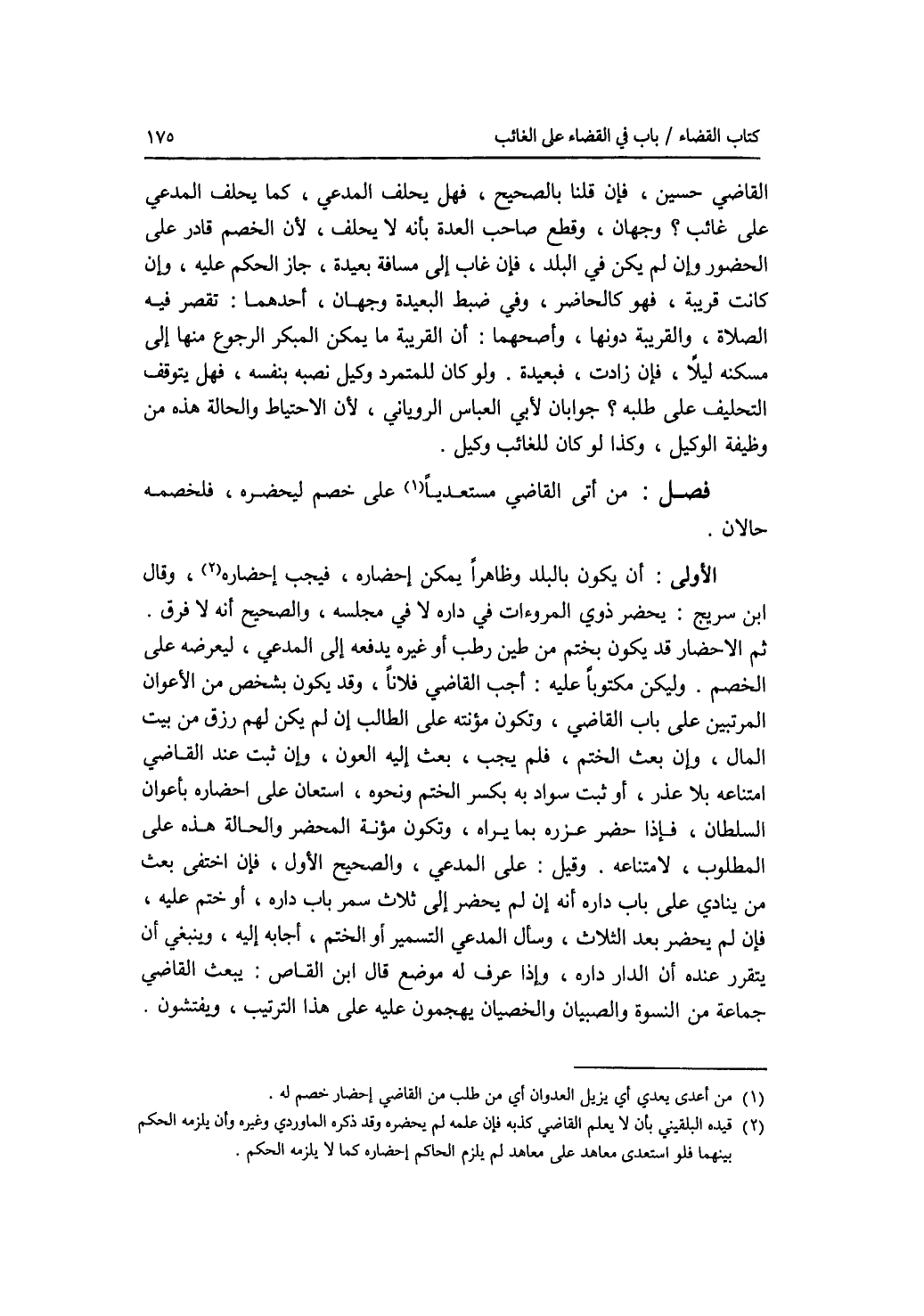 القاضي حسين، فإن قلنا بالصحيح، فهل يحلف المدعي، كما يحلف المدعي على غائب ؟ وجهان، وقطع صاحب العدة بأنه لا يحلف، لان الخصم قادر على الحضور وإن لم يكن في البلد، فإن غاب إلى مسافة بعيدة، جاز الحكم عليه، وإن كانت قريبة، فهو كالحاضر، وفي ضبط البعيدة وجهان، أحدهما: تقصر فيه الصلاة، والقريبة دونها، وأصحهما: أن القريبة ما يمكن المبكر الرجوع منها إلى مسكنه ليلا، فإن زادت، فبعيدة، ولو كان للمتمرد وكيل نصبه بنفسه، فهل يتوقف التحليف على طلبه ؟ جوابان لابي العباس الروياني: لان الاحتياط والحالة هذه من وظيفة الوكيل، وكذا لو كان للغائب وكيل. فصل من أتى القاضي مستعديا على خصم ليحضره، فلخصمه حالان. الاولى: أن يكون بالبلد وظاهرا يمكن إحضاره، فيجب إحضاره، وقال ابن سريج: يحضر ذوي المروءات في داره لا في مجلسه، والصحيح أنه لا فرق. ثم الاحضار قد يكون بختم من طين رطب أو غيره يدفعه إلى المدعي، ليعرضه على الخصم. وليكن مكتوبا عليه: أجب القاضي فلانا، وقد يكون بشخص من الاعوان المرتبين على باب القاضي، وتكون مؤنته على الطالب إن لم يكن لهم رزق من بيت المال، وإن بعث الختم، فلم يجب، بعث إليه العون، وإن ثبت عند القاضي امتناعه بلا عذر، أو ثبت سواد به بكسر الختم ونحوه، استعان على إحضاره بأعوان السلطان، فإذا حضر عزره بما يراه، وتكون مؤنة المحضر والحالة هذه على المطلوب، لامتناعه. وقيل: على المدعي، والصحيح الاول، فإن اختفى بعث من ينادي على باب داره أنه إن لم يحضر إلى ثلاث سمر باب داره، أو ختم عليه، فإن لم يحضر بعد الثلاث، وسأل المدعي التسمير أو الختم، أجابه إليه، وينبغي أن يتقرر عنده أن الدار داره، وإذا عرف له موضع قال ابن القاص: يبعث القاضي جماعة من النسوة والصبيان والخصيان يهجمون عليه على هذا الترتيب، ويفتشون.
