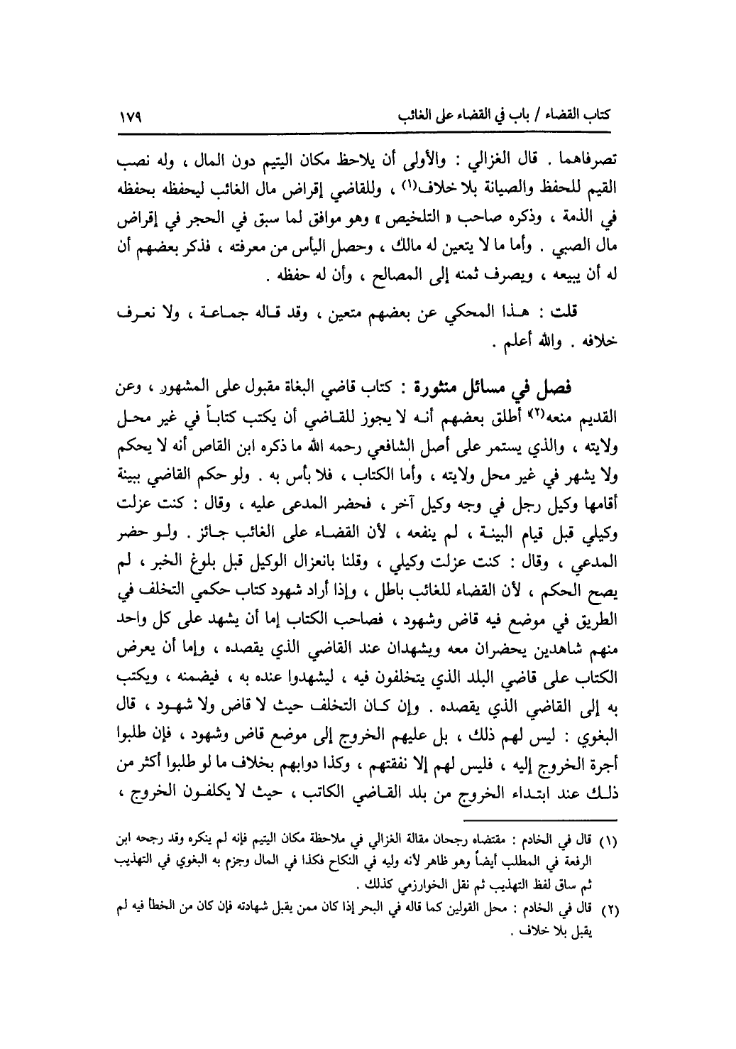 تصرفاهما. قال الغزالي: والاولى أن يلاحظ مكان اليتيم دون المال، وله نصب القيم للحفظ والصيانة بلا خلاف. وللقاضي إقراض مال الغائب ليحفظه بحفظه في الذمة، وذكره صاحب التلخيص وهو موافق لما سبق في الحجر في إقراض مال الصبي. وأما ما لا يتعين له مالك، وحصل اليأس من معرفته، فذكر بعضهم أن له أن يبيعه، ويصرف ثمنه إلى المصالح، وأن له حفظه. قلت: هذا المحكي عن بعضهم متعين، وقد قاله جماعة، ولا نعرف خلافه. والله أعلم. فصل في مسائل منثورة كتاب قاضي البغاة مقبول على المشهور، وعن القديم منعه، أطلق بعضهم أنه لا يجوز للقاضي أن يكتب كتابا في غير محل ولايته، والذي يستمر على أصل الشافعي رحمه الله ما ذكره ابن القاص أنه لا يحكم ولا يشهر في غير محل ولايته، وأما الكتاب، فلا بأس به. ولو حكم القاضي ببينة أقامها وكيل رجل في وجه وكيل آخر، فحضر المدعى عليه، وقال: كنت عزلت وكيلي قبل قيام البينة، لم ينفعه، لان القضاء على الغائب جائز. ولو حضر المدعي، وقال: كنت عزلت وكيلي، وقلنا بانعزال الوكيل قبل بلوغ الخبر، لم يصح الحكم، لان القضاء للغائب باطل، وإذا أراد شهود كتاب حكمي التخلف في الطريق في موضع فيه قاض وشهود، فصاحب الكتاب إما أن يشهد على كل واحد منهم شاهدين يحضران معه ويشهدان عند القاضي الذي يقصده، وإما أن يعرض الكتاب على قاضي البلد الذي بتخلفون فيه، ليشهدوا عنده به، فيضمنه، ويكتب به إلى القاضي الذي يقصده. وإن كان التخلف حيث لا قاض ولا شهود، قال البغوي: ليس لهم ذلك، بل عليهم الخروج إلى موضع فيه قاض وشهود، فإن طلبوا أجرة الخروج إليه، فليس لهم إلا نفقتهم، وكذا دوابهم بخلاف ما لو طلبوا أكثر من ذلك عند ابتداء الخروج من بلد القاضي الكاتب، حيث لا يكلفون الخروج،
