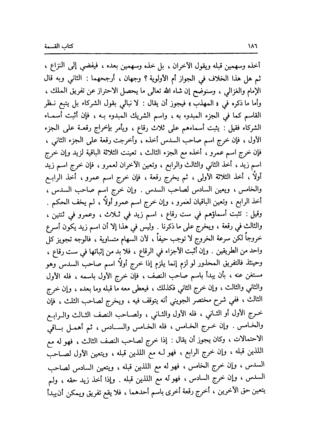 آخذه وسهمين قبله ويقول الآخران، بل خذه وسهمين بعده، فيفضي إلى النزاع، ثم هل هذا الخلاف في الجواز أم الاولوية ؟ وجهان، أرجحهما: الثاني وبه قال الامام والغزالي، وسنوضح إن شاء الله تعالى ما يحصل به الاحتراز عن تفريق الملك، وأما ما ذكره في المهذب فيجوز أن يقال: لا نبالي بقول الشركاء بل يتبع نظر القاسم كما في الجزء المبدوء به، واسم الشريك المبدوء به، فإن أثبت أسماء الشركاء فقيل: يثبت أسماءهم على ثلاث رقاع، ويأمر بإخراج رقعة على الجزء الاول، فإن خرج اسم صاحب السدس أخذه، وأخرجت رقعة على الجزء الثاني، فإن خرج اسم عمرو، أخذه مع الجزء الثالث، تعينت الثلاثة الباقية لزيد، وإن خرج اسم زيد، أخذ الثاني والثالث والرابع، وتعين الآخران لعمرو، فإن خرج اسم زيد أولا، أخذ الثلاثة الاولى، ثم يخرج رقعة، فإن خرج اسم عمرو، أخذ الرابع والخامس، ويعين السادس لصاحب السدس. وإن خرج اسم طاحب السدس، أخذ الرابع، وتعين الباقيان لعمرو، وإن خرج اسم عمرو أولا، لم يخف الحكم. وقيل: تثبت أسماؤهم في ست رقاع، اسم زيد في ثلاث، وعمرو في ثنتين، والثالث في رقعة، ويخرج على ما ذكرنا. وليس في هذا إلا أن اسم زيد يكون أسرع خروجا لكن سرعة الخروج لا توجب حيفا، لان السهام متساوية، فالوجه تجويز كل واحد من الطريقين. وإن أثبت الاجزاء في الرقاع، فلا بد من إثباتها في ست رقاع، وحينئذ فالتفريق المحذور لو لزم إنما يلزم إذا خرج أولا اسم صاحب السدس وهو مستغن عنه، بأن يبدأ باسم صاحب النصف، فإن خرج الاول باسمه، فله الاول والثاني والثالث، وإن خرج الثاني فكذلك، فيعطى معه ما قبله وما بعده، وإن خرج الثالث، ففي شرح مختصر الجويني أنه يتوقف فيه، ويخرج لصاحب الثلث، فإن خرج الاول أو الثاني، فله الاول والثاني، ولصاحب النصف الثالث والرابع والخامس. وإن خرج الخامس، فله الخامس والسادس، ثم أهمل باقي الاحتمالات، وكان يجوز أن يقال: إذا خرج لصاحب النصف الثالث، فهو له مع اللذين قبله، وإن خرج الرابع، فهو له مع اللذين قبله، ويتعين الاول لصاحب السدس، وإن خرج الخامس، فهو له مع اللذين قبله، ويتعين السادس لصاحب السدس، وإن خرج السادس، فهو له مع اللذين قبله. وإذا أخذ زيد حقه، ولم يتعين حق الآخرين، أخرج رقعة أخرى باسم أحدهما، فلا يقع تفريق ويمكن أن يبدأ