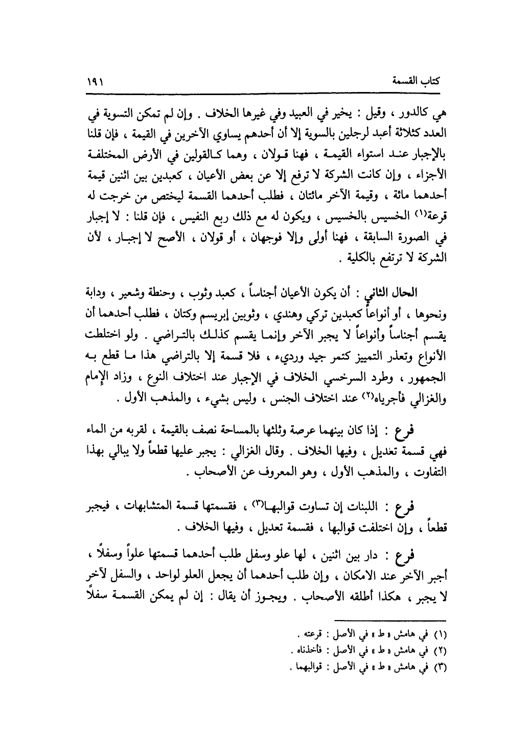 هي كالدور، وقيل: يخير في العبيد وفي غيرها الخلاف. وإن لم تمكن التسوية في العدد كثلاثة أعبد لرجلين بالسوية إلا أن أحدهم يساوي الآخرين في القيمة، فإن قلنا بالاجبار عند استواء القيمة، فهنا قولان، وهما كالقولين في الارض المختلفة الاجزاء، وإن كانت الشركة لا ترفع إلا عن بعض الاعيان، كعبدين بين اثنين قيمة أحدهما مائة، وقيمة الآخر مائتان، فطلب أحدهما القسمة ليختص من خرجت له قرعة الخسيس بالخسيس، ويكون له مع ذلك ربع النفيس، فإن قلنا: لا إجبار في الصورة السابقة، فهنا أولى وإلا فوجهان، أو قولان، الاصح لا إجبار، لان الشركة لا ترتفع بالكلية. الحال الثاني: أن يكون الاعيان أجناسا، كعبد وثوب، وحنطة وشعير، ودابة ونحوها، أو أنواعا كعبدين تركي وهندي، وثوبين إبريسم وكتان، فطلب أحدهما أن يقسم أجناسا وأنواعا لا يجبر الآخر وإنما يقسم كذلك بالتراضي. ولو اختلطت الانواع وتعذر التمييز كتمر جيد وردئ، فلا قسمة إلا بالتراضي هذا ما قطع به الجمهور، وطرد السرخسي الخلاف في الاجبار عند اختلاف النوع، وزاد الامام والغزالي فأجرياه عند اختلاف الجنس، وليس بشئ، والمذهب الاول. فرع إذا كان بينهما عرصة وثلثها بالمساحة نصف بالقيمة، لقربه من الماء فهي قسمة تعديل، وفيها الخلاف. وقال الغزالي: يجبر عليها قطعا ولا يبالي بهذا التفاوت، والمذهب الاول، وهو المعروف عن الاصحاب. فرع اللبنات إن تساوت قوالبها، فقسمتها قسمة المتشابهات، فيجبر قطعا، وإن اختلفت قوالبها، فقسمة تعديل، وفيها الخلاف. فرع دار بين اثنين، لها علو وسفل طلب أحدهما قسمتها علوا وسفلا، أجبر الآخر عند الامكان، وإن طلب أحدهما أن يجعل العلو لواحد، والسفل لآخر لا يجبر، هكذا أطلقه الاصحاب. ويجوز أن يقال: إن لم يمكن القسمة سفلا