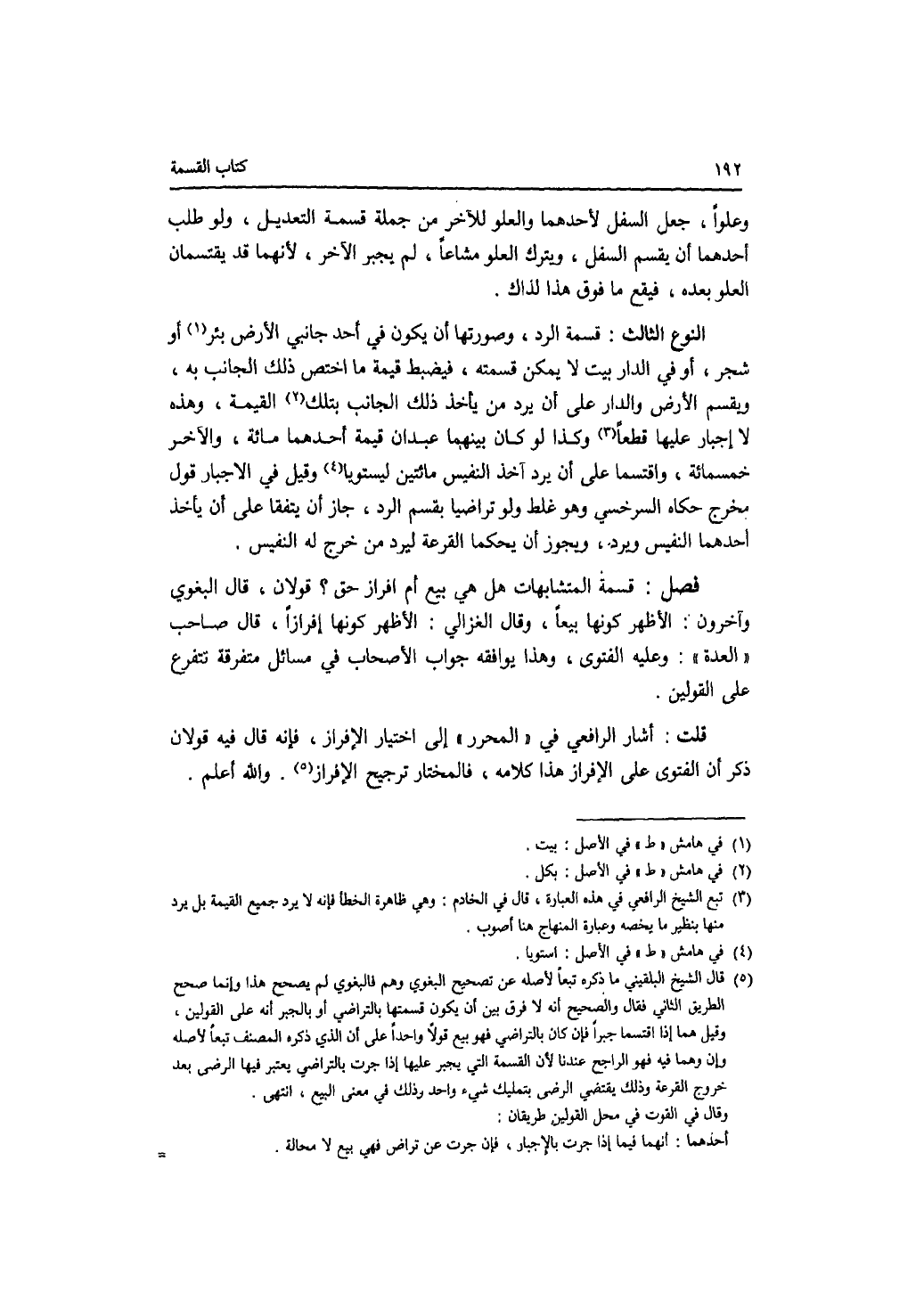 وعلوا، جعل السفل لاحدهما والعلو للآخر من جملة قسمة التعديل، ولو طلب أحدهما أن يقسم السفل، ويترك العلو مشاعا، لم يجبر الآخر، لانهما قد يقتسمان العلو بعده، فيقع ما فوق هذا لذاك. النوع الثالث: قسمة الرد، وصورتها أن يكون في أحد جانبي الارض بئر أو شجر، أو في الدار بيت لا يمكن قسمته، فيضبط قيمة ما اختص ذلك الجانب به، ويقسم الارض والدار على أن يرد من يأخذ ذلك الجانب بتلك القيمة، وهذه لا إجبار عليها قطعا وكذا لو كان بينهما عبدان قيمة أحدهما مائة، والآخر خمسمائة، واقتسما على أن يرد آخذ النفيس مائتين ليستويا وقيل في الاجبار قول مخرج حكاه السرخسي وهو غلط. ولو تراضيا بقسم الرد، جاز أن يتفقا على أن يأخذ أحدهما النفيس ويرد، ويجوز أن يحكما القرعة ليرد من خرج له النفيس.
