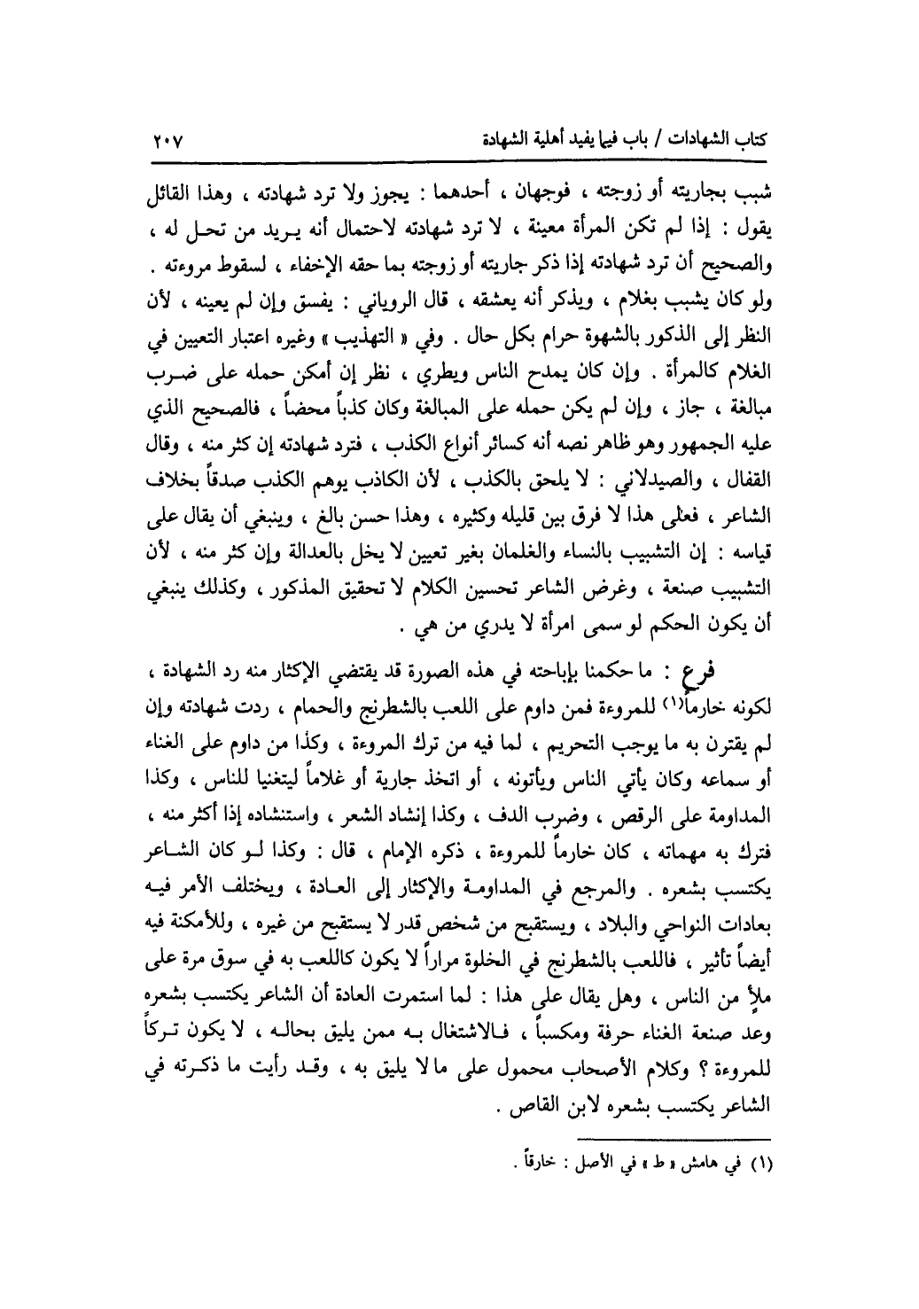 شبب بجاريته أو زوجته، فوجهان، أحدهما: يجوز ولا ترد شهادته، وهذا القائل يقول: إذا لم تكن المرأة معينة، لا ترد شهادته لاحتمال أنه يريد من تحل له، والصحيح أن ترد شهادته إذا ذكر جاريته أو زوجته بما حقه الاخفاء، لسقوط مروءته. ولو كان يشبب بغلام، ويذكر أنه يعشقه، قال الروياني: يفسق وإن لم يعينه، لان النظر إلى الذكور بالشهوة حرام بكل حال. وفي التهذيب وغيره اعتبار التعيين في الغلام كالمرأة. وإن كان يمدح الناس ويطري، نظر إن أمكن حمله على ضرب مبالغة، جاز، وإن لم يكن حمله على المبالغة وكان كذبا محضا، فالصحيح الذي عليه الجمهور وهو ظاهر نصه أنه كسائر أنواع الكذب، فترد شهادته إن كثر منه، وقال القفال، والصيدلاني: لا يلحق بالكذب، لان الكاذب يوهم الكذب صدقا بخلاف الشاعر، فعلى هذا لا فرق بين قليله وكثيره، وهذا حسن بالغ، وينبغي أن يقال على قياسه: إن التشبيب بالنساء والغلمان بغير تعيين لا يخل بالعدالة وإن كثر منه، لان التشبيب صنعة، وغرض الشاعر تحسين الكلام لا تحقيق المذكور، وكذلك ينبغي أن يكون الحكم لو سمى امرأة لا يدري من هي. فرع ما حكمنا بإباحته في هذه الصورة قد يقتضي الاكثار منه رد الشهادة، لكونه خارما للمروءة فمن داوم على اللعب بالشطرنج والحمام، ردت شهادته وإن لم يقترن به ما يوجب التحريم، لما فيه من ترك المروءة، وكذا من داوم على الغناء أو سماعه وكان يأتي الناس ويأتونه، أو اتخذ جارية أو غلاما ليتغنيا للناس، وكذا المداومة على الرقص، وضرب الدف، وكذا إنشاد الشعر، واستنشاده إذا أكثر منه، فترك به مهماته، كان خارما للمروءة، ذكره الامام، قال: وكذا لو كان الشاعر يكتسب بشعره. والمرجع في المداومة والاكثار إلى العادة، ويختلف الامر فيه بعادات النواحي والبلاد، ويستقبح من شخص قدر لا يستقبح من غيره، وللامكنة فيه أيضا تأثير، فاللعب بالشطرنج في الخلوة مرارا لا يكون كاللعب به في سوق مرة على ملا من الناس، وهل يقال على هذا: لما استمرت العادة أن الشاعر يكتسب بشعره وعد صنعة الغناء حرفة ومكسبا، فالاشتغال به ممن يليق بحاله، لا يكون تركا للمروءة ؟ وكلام الاصحاب محمول على ما لا يليق به، وقد رأيت ما ذكرته في الشاعر يكتسب بشعره لابن القاص.