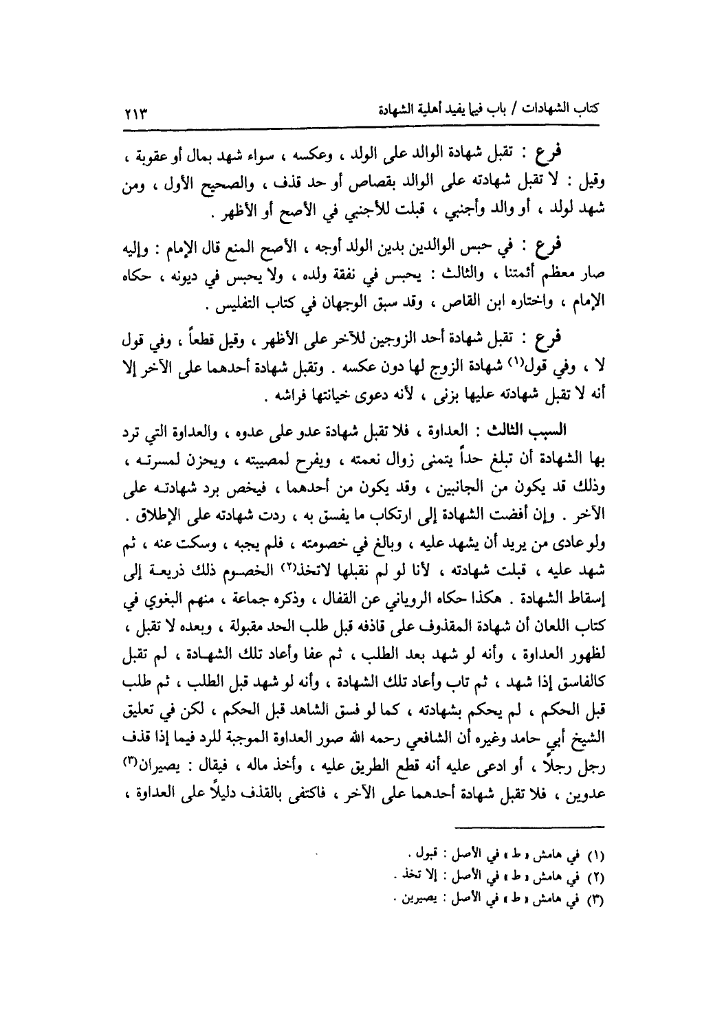 فرع تقبل شهادة الوالد على الولد، وعكسه، سواء شهد بمال أو عقوبة، وقيل: لا تقبل شهادته على الوالد بقصاص أو حد قذف، والصحيح الاول، ومن شهد لولد، أو والد وأجنبي، قبلت للاجنبي في الاصح أو الاظهر. فرع في حبس الوالدين بدين الولد أوجه، الاصح المنع قال الامام: وإليه صار معظم أئمتنا، والثالث: يحبس في نفقة ولده، ولا يحبس في ديونه، حكاه الامام، واختاره ابن القاص، وقد سبق الوجهان في كتاب التفليس. فرع تقبل شهادة أحد الزوجين للآخر على الاظهر، وقيل قطعا، وفي قول لا، وفي قول شهادة الزوج لها دون عكسه. وتقبل شهادة أحدهما على الآخر إلا أنه لا يقبل شهادته عليها بزنى، لانه دعوى خيانتها فراشه. السبب الثالث: العداوة، فلا تقبل شهادة عدو على عدوه، والعداوة التي ترد بها الشهادة أن تبلغ حدا يتمنى زوال نعمته، ويفرح لمصيبته، ويحزن لمسرته، وذلك قد يكون من الجانبين، وقد يكون من أحدهما، فيخص برد شهادته على الآخر. وإن أفضت الشهادة إلى ارتكاب ما يفسق به، ردت شهادته على الاطلاق. ولو عادى من يريد أن يشهد عليه، وبالغ في خصومته، فلم يجبه، وسكت عنه، ثم شهد عليه، قبلت شهادته، لانا لو لم نقبلها لاتخذ الخصوم ذلك ذريعة إلى إسقاط الشهادة. هكذا حكاه الروياني عن القفال، وذكره جماعة، منهم البغوي في كتاب اللعان أن شهادة المقذوف على قاذفه قبل طلب الحد مقبولة، وبعده لا تقبل، لظهور العداوة، وأنه لو شهد بعد الطلب، ثم عفا وأعاد تلك الشهادة، لم تقبل كالفاسق إذا شهد، ثم تاب وأعاد تلك الشهاد، وأنه لو شهد قبل الطلب، ثم طلب قبل الحكم، لم يحكم بشهادته، كما لو فسق الشاهد قبل الحكم، لكن في تعليق الشيخ أبي حامد وغيره أن الشافعي رحمه الله صور العداوة الموجبة للرد فيما إذا قذف رجل رجلا، أو ادعى عليه أنه قطع الطريق عليه، وأخذ ماله، فيقال: يصيران عدوين، فلا تقبل شهادة أحدهما على الآخر، فاكتفى بالقذف دليلا على العداوة،