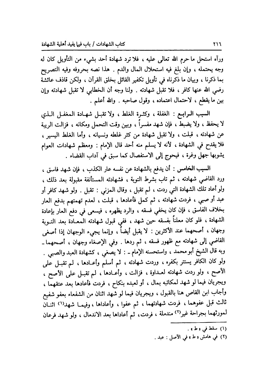 ورآه استحل ما حرم الله تعالى عليه، فلا ترد شهادة أحد بشئ من التأويل كان له وجه يحتمله، وإن بلغ فيه استحلال المال والدم. هذا نصه بحروفه وفيه التصريح بما ذكرنا، وبيانما ذكرناه في تأويل تكفير القائل بخلق القرآن، ولكن قاذف عائشة رضي الله عنها كافر، فلا تقبل شهادته. ولنا وجه أن الخطابي لا تقبل شهادته وإن بين ما يقطع، لاحتمال اعتماده، وقول صاحبه. والله أعلم. السبب الرابع: الغفلة، وكثرة الغلط، ولا تقبل شهادة المغفل الذي لا يحفظ، ولا يضبط، فإن شهد مفسرا، وبين وقت التحمل ومكانه، فزالت الريبة عن شهادته، قبلت، ولا تقبل شهادة من كثر غلطه ونسيانه، وأما الغلط اليسير، فلا يقدح في الشهادة، لانه لا يسلم منه أحد قال الامام: ومعظم شهادات العوام يشوبها جهل وغرة، فيحوج إلى الاستفصال كما سبق في آداب القضاء. السبب الخامس: أن يدفع بالشهادة عن نفسه عار الكذب، فإن شهد فاسق، ورد القاضي شهادته، ثم تاب بشرط التوبة، فشهادته المستأنفة مقبولة بعد ذلك، ولو أعاد تلك الشهادة التي ردت، لم تقبل، وقال المزني: تقبل. ولو شهد كافر أو عبد أو صبي، فردت شهادته، ثم كمل فأعادها، قبلت، لعدم تهمتهم بدفع العار بخلاف الفاسق، فإن كان يخفي فسقه، والرد يظهره، فيسعى في دفع العار بإعادة الشهادة، فلو كان معلنا بفسقه حين شهد، ففي قبول شهادته المعادة بعد التوبة وجهان، أصحهما عند الاكثرين: لا يقبل أيضا، وإنما يجئ الوجهان إذا أصغى القاضي إلى شهادته مع ظهور فسقه، ثم ردها. وفي الاصغاء وجهان، أصحهما - وبه قال الشيخ أبو محمد، واستحسنه الامام -: لا يصغي، كشهادة العبد والصبي. ولو كان الكافر يستتر بكفره، وردت شهادته، ثم أسلم وأعادها، لم تقبل على الاصح، ولو ردت شهادته لعداوة، فزالت، وأعادها، لم تقبل على الاصح، ويجريان فيما لو شهد لمكاتبه بمال، أو لعبده بنكاح، فردت فأعادها بعد عتقهما، وأجاب ابن القاص هنا بالقبول، ويجريان فيما لو شهد اثنان من الشفعاء بعفو شفيع ثالث قبل عفوهما، فردت شهادتهما، ثم عفوا، وأعاداها، وفيما شهد اثنان لمورثهما بجراحة غير مندملة، فردت، ثم أعادها بعد الاندمال، ولو شهد فرعان