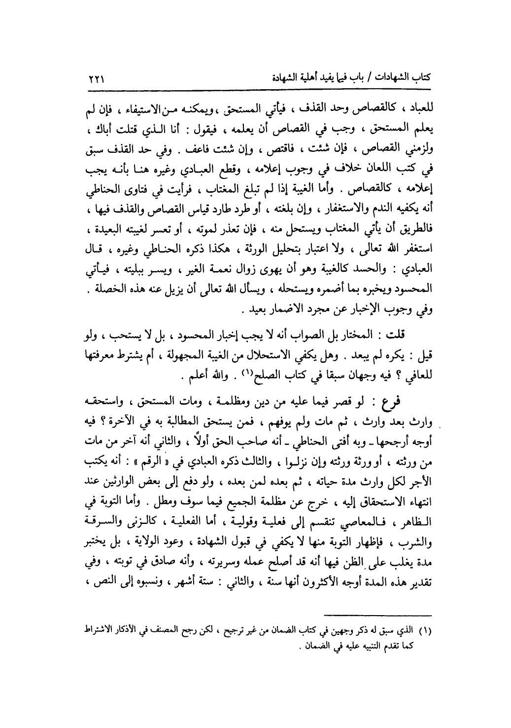 للعباد، كالقصاص وحد القذف، فيأتي المستحق، ويمكنه من الاستيفاء، فإن لم يعلم المستحق، وجب في القصاص أن يعلمه، فيقول: أنا الذي قتلت أباك، ولزمني القصاص، فإن شئت، فاقتص، وإن شئت فاعف. وفي حد القذف سبق في كتب اللعان خلاف في وجوب إعلامه، وقطع العبادي وغيره هنا بأنه يجب إعلامه، كالقصاص. وأما الغيبة إذا لم تبلغ المغتاب، فرأيت في فتاوى الحناطي أنه يكفيه الندم والاستغفار، وإن بلغته، أو طرد طارد قياس القصاص والقذف فيها، فالطريق أن يأتي المغتاب ويستحل منه، فإن تعذر لموته، أو تعسر لغيبته البعيدة، استغفر الله تعالى، ولا اعتبار بتحليل الورثة، هكذا ذكره الحناطي وغيره، قال العبادي: والحسد كالغيبة وهو أن يهوى زوال نعمة الغير، ويسر ببليته، فيأتي المحسود ويخبره بما أضمره ويستحله، ويسأل الله تعالى أن يزيل عنه هذه الخصلة، وفي وجوب الاخبار عن مجرد الاضمار بعيد. قلت: المختار بل الصواب أنه لا يجب إخبار المحسود، بل لا يستحب، ولو قيل: يكره لم يبعد. وهل يكفي الاستحلال من الغيبة المجهولة، أم يشترط معرفتها للعافي ؟ فيه وجهان سبقا في كتاب الصلح. والله أعلم. فرع لو قصر فيما عليه من دين ومظلمة، ومات المستحق، واستحقه وارث بعد وارث، ثم مات ولم يوفهم، فمن يستحق المطالبة به في الآخرة ؟ فيه أوجه أرجحها - وبه أفتى الحناطي - أنه صاحب الحق أولا، والثاني أنه آخر من مات من ورثته، أو ورثة ورثته وإن نزلوا، والثالث ذكره العبادي في الرقم: أنه يكتب الاجر لكل وارث مدة حياته، ثم بعده لمن بعده، ولو دفع إلى بعض الوارثين عند انتهاء الاستحقاق إليه، خرج عن مظلمة الجميع فيما سوف ومطل. وأما التوبة في الظاهر، فالمعاصي تنقسم إلى فعلية وقولية، أما الف علية، كالزنى والسرقة والشرب، فإظهار التوبة منها لا يكفي في قبول الشهادة، وعوالولاية، بل يختبر مدة يغلب على الظن فيها أنه قد أصلح عمله وسريرته، وأنه صادق في توبته، وفي تقدير هذه المدة أوجه الاكثرون أنها سنة، والثاني: ستة أشهر، ونسبوه إلى النص،