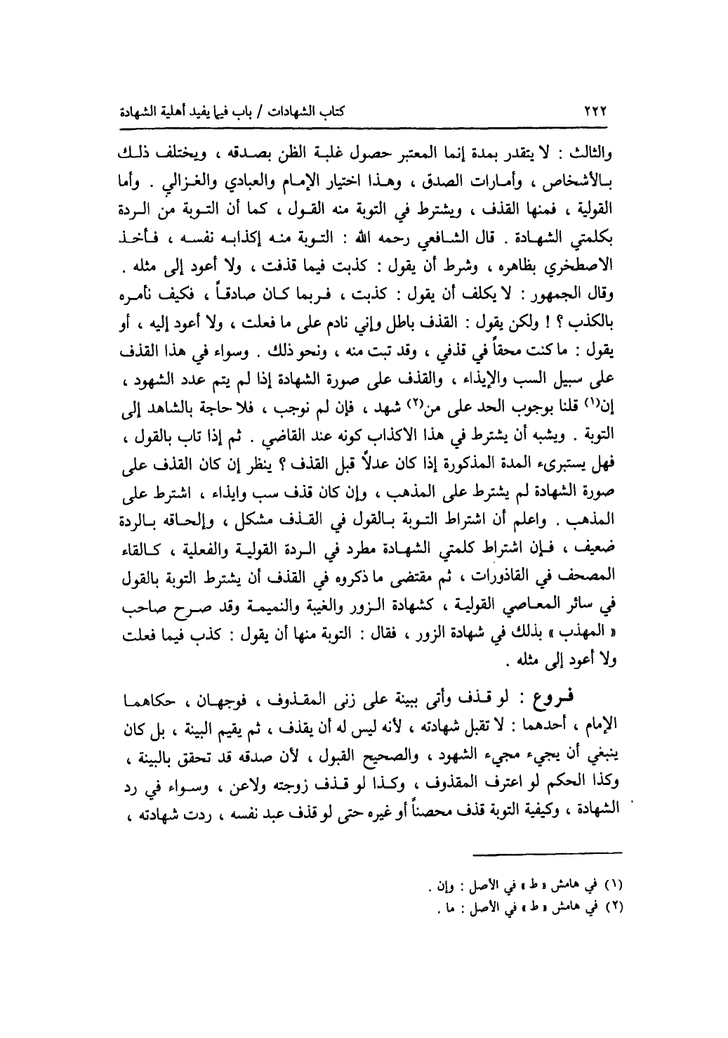 والثالث: لا يتقدر بمدة إنما المعتبر حصول غلبة الظن بصدقه، ويختلف ذلك بالاشخاص، وأمارات الصدق، وهذا اختيار الامام والعباد والغزالي. وأما القولية، فمنها القذف، ويشترط في التوبة منه القول، كما أن التوبة من الردة بكلمتي الشهادة. قال الشافعي رحمه الله: التوبة منه إكذابه نفسه، فأخذ الاصطخري بظاهره، وشرط أن يقول: كذبت فيما قذفت، ولا أعود إلى مثله. وقال الجمهور: لا يكلف أن يقول: كذبت، فربما كان صادقا، فكيف نأمره بالكذب ؟ ولكن يقول: القذف باطل وإني نادم على ما فعلت، ولا أعود إليه، أو يقول: ما كنت محقا في قذفي، وقد تبت منه، ونحو ذلك. وسواء في هذا القذف على سبيل السب والايذاء، والقذف على صورة الشهادة إذا لم يتم عدد الشهود، إن قلنا بوجوب الحد على من شهد، فإن لم نوجب، فلا حاجة بالشاهد إلى التوبة. ويشبه أن يشترط في هذا الاكذاب كونه عند القاضي. ثم إذا تاب بالقول، فهل يستبرئ المدة المذكورة إذا كان عدلا قبل القذف ؟ ينظر إن كان القذف على صورة الشهادة لم يشترط على المذهب، وإن كان قذف سب وإيذاء، اشترط على المذهب. واعلم أن اشتراط التوبة بالقول في القذف مشكل، وإلحاقه بالردة ضعيف، فإن إشتراط كلمتي الشهادة مطرد في الردة القولية والفعلية، كإلقاء المصحف في القاذورات، ثم مقتضى ما ذكروه في القذف أن يشترط التوبة بالقول في سائر المعاصي القولية، كشهادة الزور والغيبة والنميمة وقد صرح صاحب المهذب بذلك في شهادة الزور، فقال: التوبة منها أن يقول: كذبت فيما فعلت ولا أعود إلى مثله. فروع لو قذف وأتى ببينة على زنى المقذوف، فوجهان، حكاهما الامام، أحدهما: لا تقبل شهادته، لانه ليس له أن يقذف، ثم يقيم البينة، بل كان ينبغي أن يجئ مجئ الشهود، والصحيح القبول، لان صدقه قد تحقق بالبينة، وكذا الحكم لو اعترف المقذوف، وكذا لو قذف زوجته ولاعن، وسواء في رد الشهادة، وكيفية التوبة قذف محصنا أو غيره حتى لو قذف عبد نفسه، ردت شهادته،
