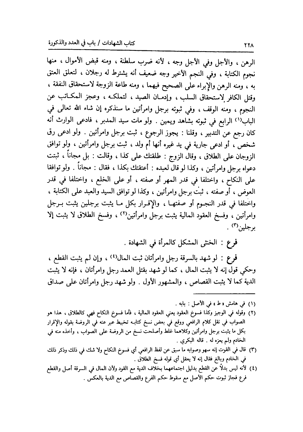 الرهن، والاجل وفي الاجل وجه، لانه ضرب سلطنة، ومنه قبض الاموال، منها نجوم الكتابة، وفي النجم الاخير وجه ضعيف أنه يشترط له رجلان، لتعلق العتق به، ومنه الرهن والابراء على الصحيح فيهما، ومنه طاعة الزوجة لاستحقاق النفقة، وقتل الكافر لاستحقاق السلب، وإدمان الصيد، لتملكه، وعجز المكاتب عن النجوم، ومنه الوقف، وفي ثبوته برجل وامرأتين ما سنذكره إن شاء الله تعالى في الباب الرابع في ثبوته بشاهد ويمين. ولو مات سيد المدبر، فادعى الوارث أنه كان رجع عن التدبير، وقلنا: يجوز الرجوع، ثبت برجل وامرأتين. ولو ادعى رق شخص، أو ادعى جارية في يد غيره أنها أم ولد، ثبت برجل وامرأتين، ولو توافق الزوجان على الطلاق، وقال الزوج: طلقتك على كذا، وقالت: بل مجانا، ثبتت دعواه برجل وامرأتين، وكذا لو فالعبده: أعتقتك بكذا، فقال: مجانا. ولو توافقا على النكاح، واختلفا في قدر المهر أو صفته، أو على الخلع، واختلفا في إ قدر العوض، أو صفته، ثبت برجل وامرأتين، وكذا لو توافق السيد والعبد على الكتابة، واختلفا في قدر النجوم أو صفتها، والاقرار بكل ما يثبت برجلين يثبت برجل وامرأتين، وفسخ العقود المالية يثبت برجل وامرأتين، وفسخ الطلاق لا يثبت إلا برجلين. فرع الخنثى المشكل كالمرأة في الشهادة. فرع لو شهد بالسرقة رجل وامرأتان ثبت المال، وإن لم يثبت القطع، وحكي قول أنه لا يثبت المال، كما لو شهد بقتل العمد رجل وامرأتان، فإنه لا يثبت الدية كما لا يثبت القصاص، والمشهور الاول. ولو شهد رجل وامرأتان على صداق