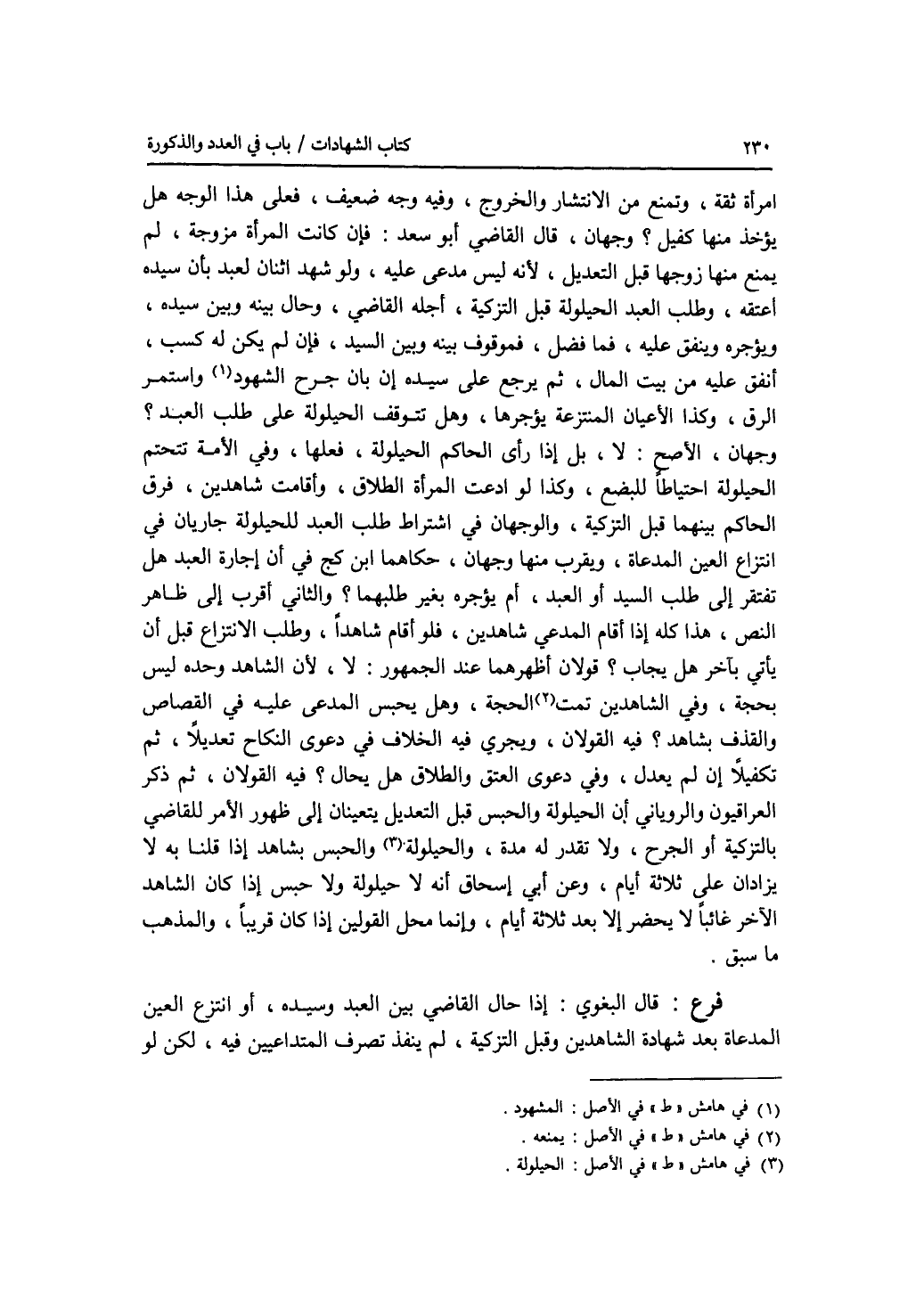 امرأة ثقة، وتمنع من الانتشار والخروج، وفيه وجه ضعيف، فعلى هذا الوجه هل يؤخذ منها كفيل ؟ وجهان، قال القاضي أبو سعد: فإن كانت المرأة مزوجة، لم يمنع منها زوجها قبل التعديل، لانه ليس مدعى عليه، ولو شهد اثنان لعبد بأن سيده أعتقه، وطلب العبد الحيلولة قبل التزكية، أجله القاضي، وحال بينه وبين سيده، ويؤجره وينفق عليه، فما فضل فموقوف بينه وبين السيد، فإن لم يكن له كسب، أنفق عليه من بيت المال، ثم يرجع على سيده إن بان جرح الشهود واستمر الرق، وكذا الاعيان المنتزعة يؤجرها، وهل تتوقف الحيلولة على طلب العبد ؟ وجهان، الاصح: لا، بل إذا رأى الحاكم الحيلولة، فعلها، وفي الامة تتحتم الحيلولة احتياطا للبضع، وكذا لو ادعت المرأة الطلاق، وأقامت شاهدين، فرق الحاكم بينهما قبل التزكية، والوجهان في اشتراط طلب العبد للحيلولة جاريان في انتزاع العين المدعاة، ويقرب منها وجهان، حكاهما ابن كج في أن إجارة العبد هل تفتقر إلى طلب السيد أو العبد، أم يؤجره بغير طلبهما ؟ والثاني أقرب إلى ظاهر النص، هذا كله إذا أقام المدعي شاهدين، فلو أقام شاهدا، وطلب الانتزاع قبل أن يأتي بآخر هل يجاب ؟ قولان أظهرهما عند الجمهور: لا، لان الشاهد وحده ليس بحجة، وفي الشاهدين تمت الحجة، وهل يحبس المدعى عليه في القصاص والقذف بشاهد ؟ فيه القولان، ويجري فيه الخلاف في دعوى النكاح تعديلا، ثم تكفيلا إن لم يعدل، وفي دعوى العتق والطلاق هل يحال ؟ فيه القولان، ثم ذكر العراقيون والروياني أن الحيلولة والحبس قبل التعديل يتعينان إلى ظهور الامر للقاضي بالتزكية أو الجرح، ولا تقدر له مدة، والحيلولة والحبس بشاهد إذا قلنا به لا يزادان على ثلاثة أيام، وعن أبي إسحق أنه لا حيلولة ولا حبس إذا كان الشاهد الآخر غائبا لا يحضر إلا بعد ثلاثة أيام، وإنما محل القولين إذا كان قريبا، والمذهب ما سبق. فرع قال البغوي: إذا حال القاضي بين العبد وسيده، أو انتزع العين المدعاة بعد شهادة الشاهدين وقبل التزكية، لم ينفذ تصرف المتداعيين فيه، لكن لو