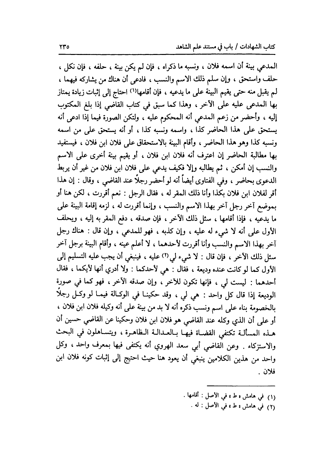 المدعي بينة أن اسمه فلان، ونسبه ما ذكراه، فإن لم يكن بينة حلفه، فإن نكل، حلف واستحق، وإن سلم ذلك الاسم والنسب، فادعى أن هناك من يشاركه فيهما، لم يقبل منه حتى يقيم البينة على ما يدعيه، فإن أقامها احتاج إلى اثبات زيادة يمتاز بها المدعى عليه على الآخر، وهذا كما سبق في كتاب القاضي إذا بلغ المكتوب إليه، وأحضر من زعم المدعي أنه المحكوم عليه، ولتكن الصورة فيما إذا ادعى أنه يستحق على هذا الحاضر كذا، واسمه ونسبه كذا، أو أنه يستحق على من اسمه ونسبه كذا وهو هذا الحاضر، وأقام البينة بالاستحقاق على فلان ابن فلان، فيستفيد بها مطالبة الحاضر إن اعترف أنه فلان ابن فلان، أو يقيم بينة أخرى على الامم و النسب إن أمكن، ثم يطالبه وإلا فكيف يدعي على فلان ابن فلان من غير أن يربط الدعوى بحاضر، وفي الفتاوى أيضا أنه لو أحضر رجلا عند القاضي، وقال: إن هذا أقر لفلان ابن فلان بكذا وأنا ذلك المقر له، فقال الرجل: نعم أقررت، لكن هنا أو بموضع آخر رجل آخر بهذا الاسم والنسب، وإنما أقررت له، لزمه إقامة البينة على ما يدعيه، فإذا أقامها، سئل ذلك الآخر، فإن صدقه، دفع المقر به إليه، ويحلف الاول على أنه لا شئ له عليه، وإن كذبه، فهو للمدعي، وإن قال: هناك رجل آخر بهذا الاسم والنسب وأنا أقررت لاحدهما، لا أعلم عينه، وأقام البينة برجل آخر سئل ذلك الآخر، فإن قال: لا شئ لي عليه، فينبغي أن يجب عليه التسليم إلى الاول كما لو كانت عنده وديعة، فقال: هي لاحدكما، ولا أدري أنها لايكما، فقال أحدهما: ليست لي، فإنها تكون للآخر، وإن صدقه الآخر، فهو كما في صورة الوديعة إذا قال كل واحد: هي لي، وقد حكينا في الوكالة فيما لو وكل رجلا بالخصومة بناء على اسم ونسب ذكره أنه لا بد من بينة على أنه وكيله فلان ابن فلان، أو على أن الذي وكله عند القاضي هو فلان ابن فلان وحكينا عن القاضي حسين أن هذه المسألة يكتفي القضاة فيها بالعدالة الظاهرة، ويتساهلون في البحث والاستزكاء. وعن القاضي أبي سعد الهروي أنه يكتفى فيها بمعرف واحد، وكل واحد من هذين الكلامين ينبغي أن يعود هنا حيث احتيج إلى إثبات كونه فلان ابن