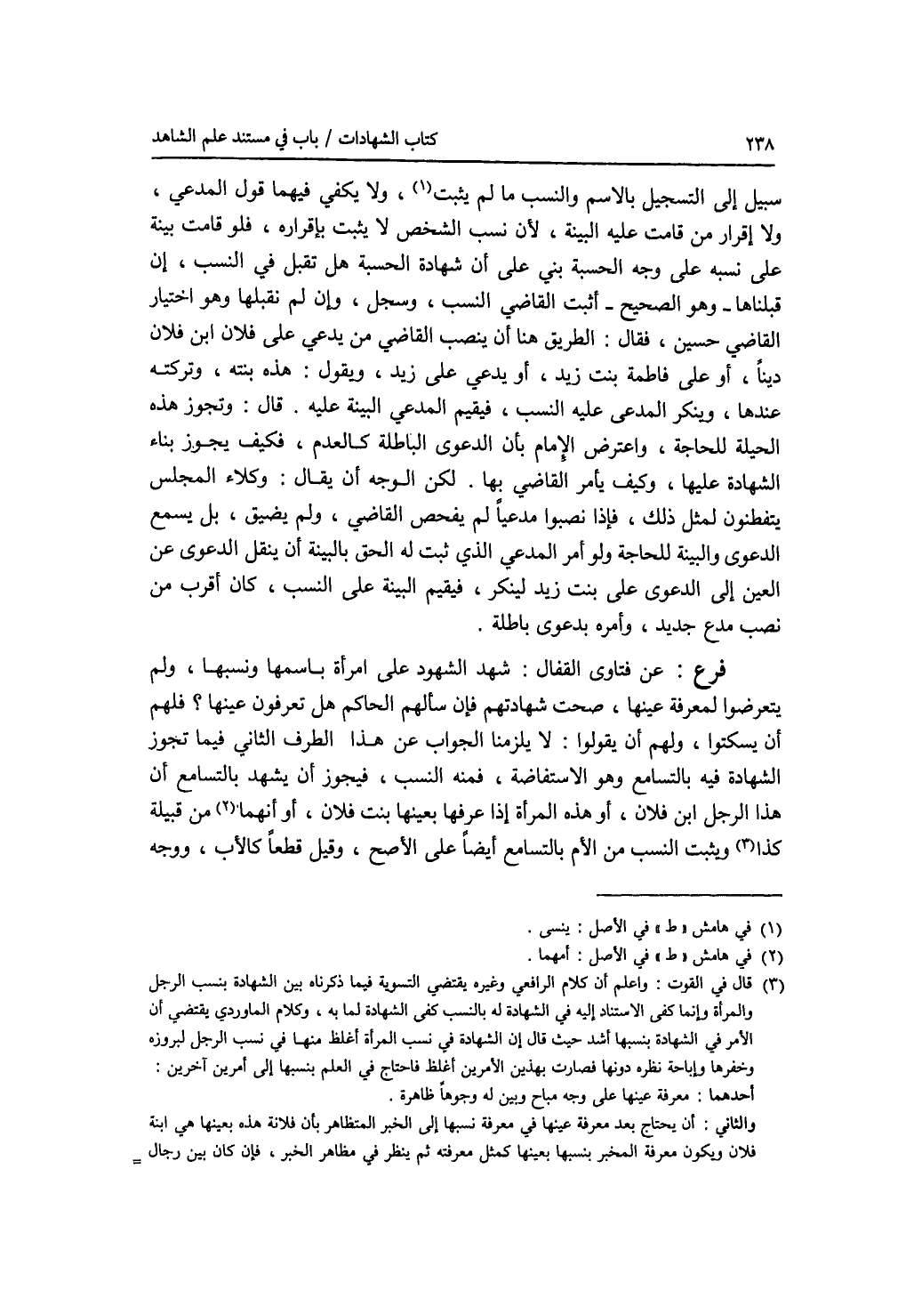 الطرف الثاني : فيما تجوز الشهادة فيه بالتسامع وهو الاستفاضة، فمنه النسب، فيجوز أن يشهد بالتسامع أن هذا الرجل ابن فلان، أو هذه المرأة إذا عرفها بعينها بنت فلان، أو أنهما من قبيلة كذا، ويثبت النسب من الام بالتسامع أيضا على الاصح، وقيل قطعا كالاب، ووجه