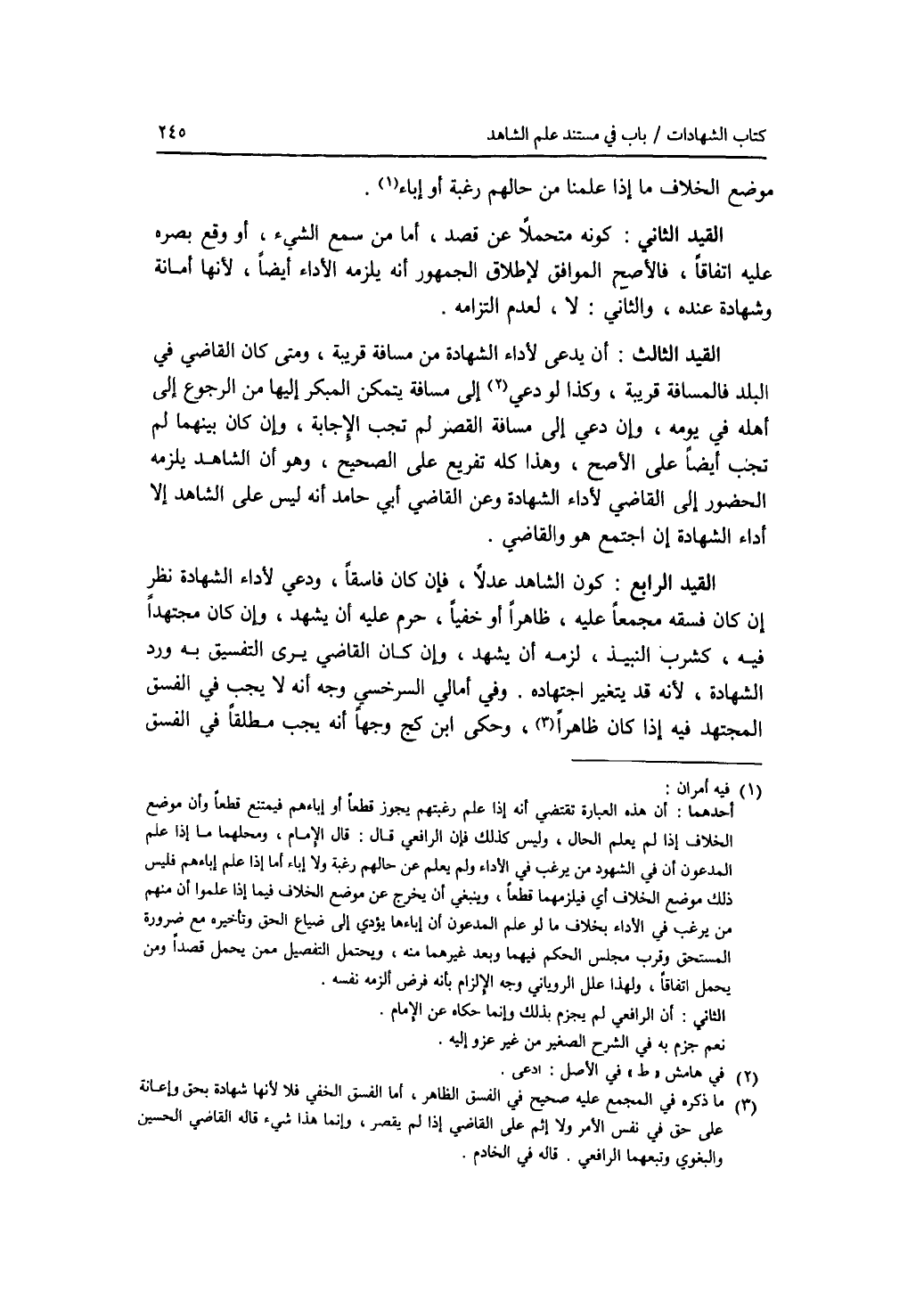 موضع الخلاف ما إذا علمنا من حالهم رغبة أو إباء. القيد الثاني: كونه متحملا عن قصد، أما من سمع الشئ، أو وقع بصره عليه اتفاقا، فالاصح الموافق لاطلاق الجمهور أنه يلزمه الاداء أيضا، لانها أمانة وشهادة عنده، والثاني: لا، لعدم التزامه. القيد الثالث: أن يدعى لاداء الشهادة من مسافة قريبة، ومتى كان القاضي في البلد فالمسافة قريبة، وكذا لو دعي إلى مسافة يتمكن المبكر إليها من الرجوع إلى أهله في يومه، وإن دعي إلى مسافة القصر لم تجب الاجابة، وإن كان بينهما لم تجب أيضا على الاصح، وهذا كله تفريع على الصحيح، وهو أن الشاهد يلزمه الحضور إلى القاضي لاداء الشهادة وعن القاضي أبي حامد أنه ليس على الشاهد إلا أداء الشهادة إن اجتمع هو والقاضي. القيد الرابع: كون الشاهد عدلا، فإن كان فاسقا، ودعي لاداء الشهادة نظر إن كان فسقه مجمعا عليه، ظاهرا أو خفيا، حرم عليه أن يشهد، وإن كان مجتهدا فيه، كشرب النبيذ، لزمه أن يشهد، وإن كان القاضي يرى التفسيق به ورد الشهادة، لانه قد يتغير اجتهاده. وفي أمالي السرخسي وجه أنه لا يجب في الفسق المجتهد فيه إذا كان ظاهرا، وحكى ابن كج وجها أنه يجب مطلقا في الفسق
