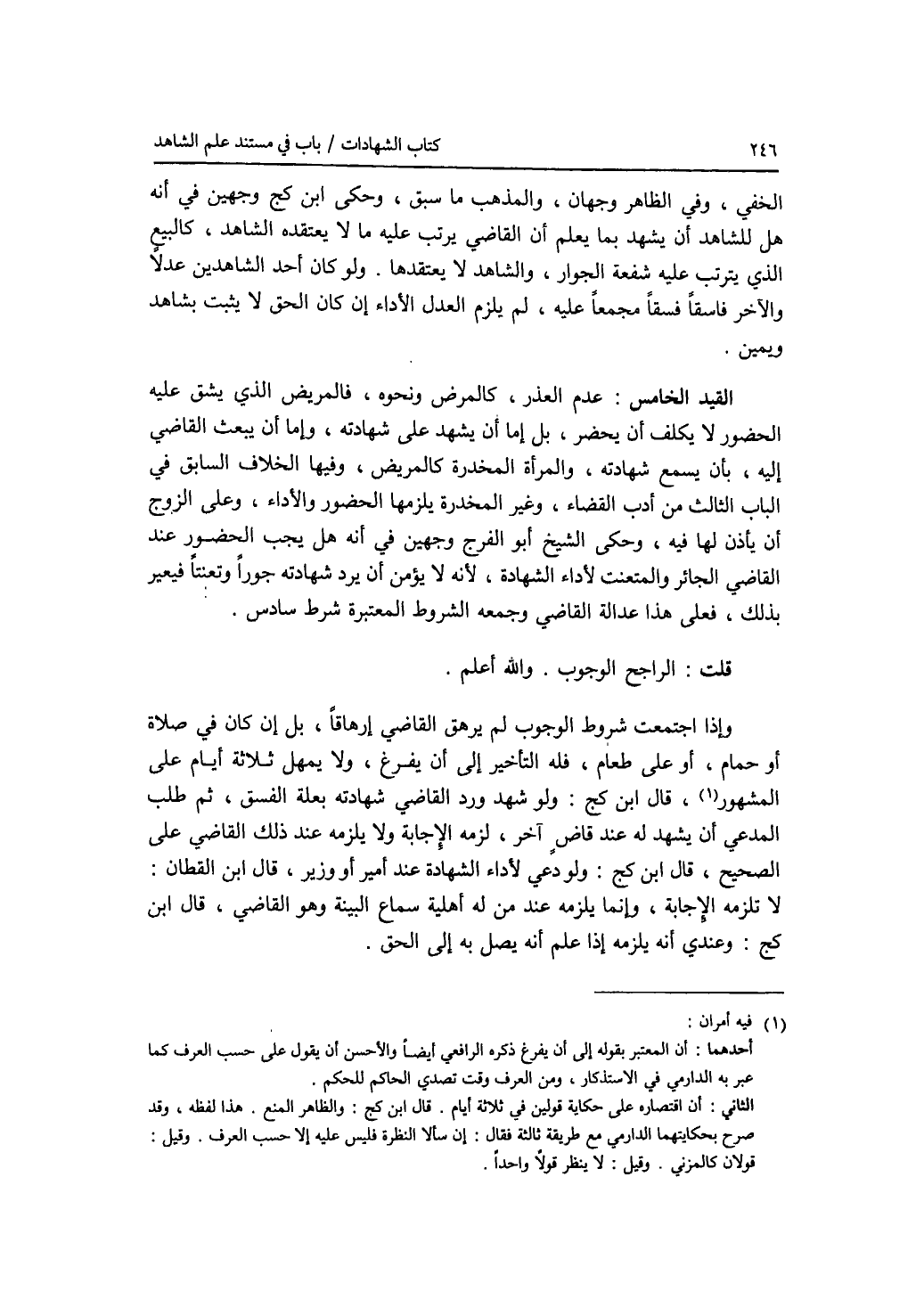 الخفي، وفي الظاهر وجهان، والمذهب ما سبق، وحكى ابن كج وجهين في أنه هل للشاهد أن يشهد بما يعلم أن القاضي يرتب عليه ما لا يعتقده الشاهد، كالبيع الذي يترتب عليه شفعة الجوار، والشاهد لا يعتقدها. ولو كان أحد الشاهدين عدلا والآخر فاسقا فسقا مجمعا عليه، لم يلزم العدل الاداء إن كان الحق لا يثبت بشاهد ويمين. القيد الخامس: عدم العذر، كالمرض ونحوه، فالمريض الذي يشق عليه الحضور لا يكلف أن يحضر، بل إما أن يشهد على شهادته، وإما أن يبعث القاضي إليه، بأن يسمع شهادته، والمرأة المخدرة كالمريض، وفيها الخلاف السابق في الباب الثالث من أدب القضاء، وغير المخدرة يلزمها الحضور والاداء، وعلى الزوج أن يأذن لها فيه، وحكى الشيخ أبو الفرج وجهين في أنه هل يجب الحضور عند القاضي الجائر والمتعنت لاداء الشهادة، لانه لا يؤمن أن يرد شهادته جورا وتعنتا فيعير بذلك، فعلى هذا عدالة القاضي وجمعه الشروط المعتبرة شرط سادس. قلت: الراجح الوجوب. والله أعلم. وإذا اجتمعت شروط الوجوب لم يرهق القاضي إرهاقا، بل إن كان في صلاة أو حمام، أو على طعام، فله التأخير إلى أن يفرغ، ولا يمهل ثلاثة أيام على المشهور، قال ابن كج: ولو شهد ورد القاضي شهادته بعلة الفسق، ثم طلب المدعي أن يشهد له عند قاض آخر، لزمه الاجابة ولا يلزمه عند ذلك القاضي على الصحيح، قال ابن كج: ولو دعي لاداء الشهادة عند أمير أو وزير، قال ابن القطان: لا تلزمه الاجابة، وإنما يلزمه عند من له أهلية سماع البينة وهو القاضي، قال ابن كج: وعندي أنه يلزمه إذا علم أنه يصل به إلى الحق.