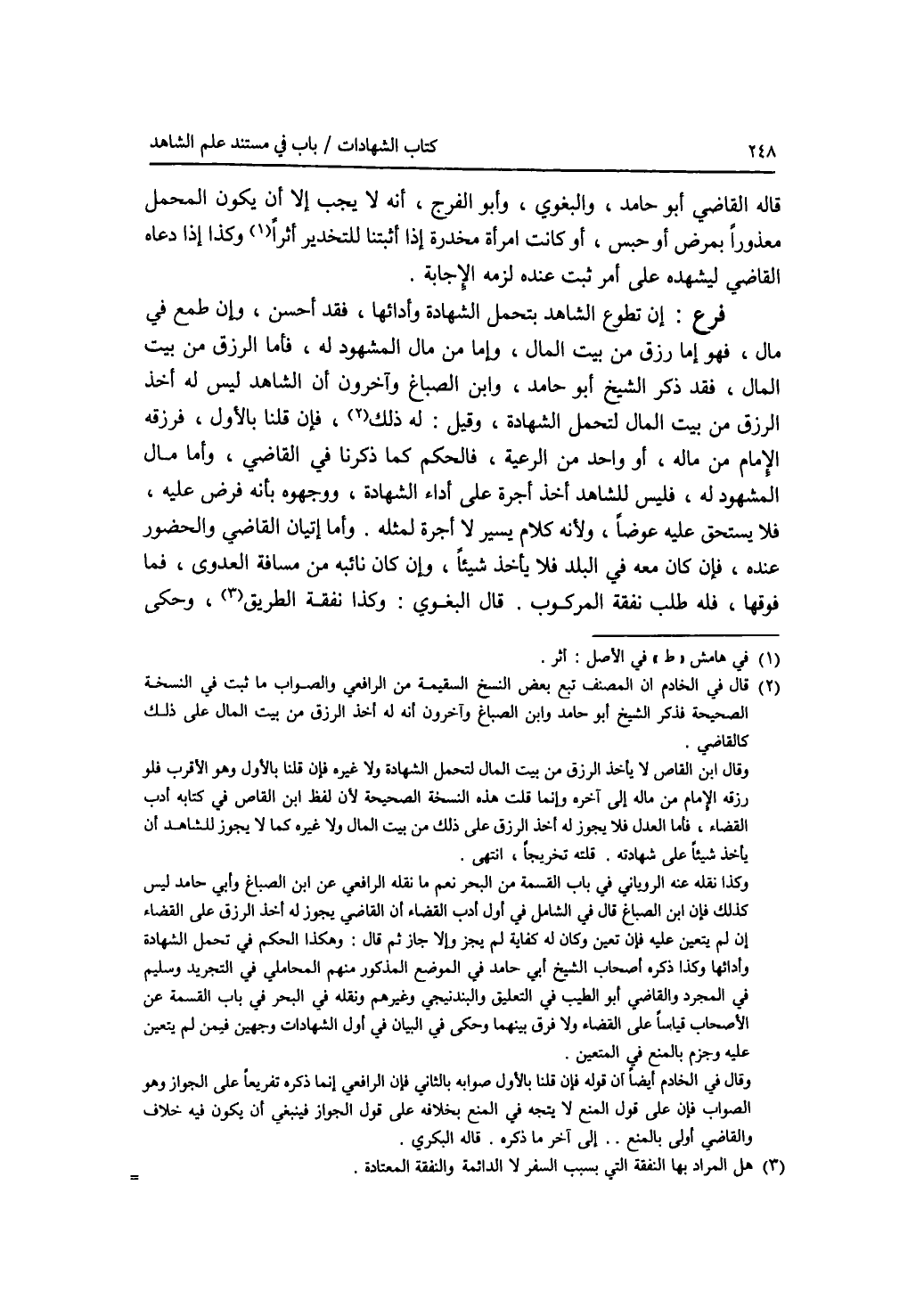 قاله القاضي أبو حامد، والبغوي، وأبو الفرج، أنه لا يجب إلا أن يكون المحمل معذورا بمرض أو حبس، أو كانت امرأة مخدرة إذا أثبتنا للتخدير أثرا وكذا إذا دعاه القاضي ليشهده على أمر ثبت عنده لزمه الاجابة. فرع إن تطوع الشاهد بتحمل الشهادة وأدائها، فقد أحسن، وإن طمع في مال، فهو إما رزق من بيت المال، وإما من مال المشهود له، فأما الرزق من بيت المال، فقد ذكر الشيخ أبو حامد، وابن الصباغ وآخرون أن الشاهد ليس له أخذ الرزق من بيت المال لتحمل الشهادة، وقيل: له ذلك، فإن قلنا بالاول، فرزقه الامام من ماله، أو واحد من الرعية، فالحكم كما ذكرنا في القاضي، وأما مال المشهود له، فليس للشاهد أخذ أجرة على أداء الشهادة، ووجهوه بأنه فرض عليه، فلا يستحق عليه عوضا، ولانه كلام يسير لا أجرة لمثله. وأما إتيان القاضي والحضور عنده، فإن كان معه في البلد فلا يأخذ شيئا، وإن كان نائبه من مسافة العدوى، فما فوقها، فله طلب نفقة المركوب. قال البغوي: وكذا نفقة الطريق، وحكى