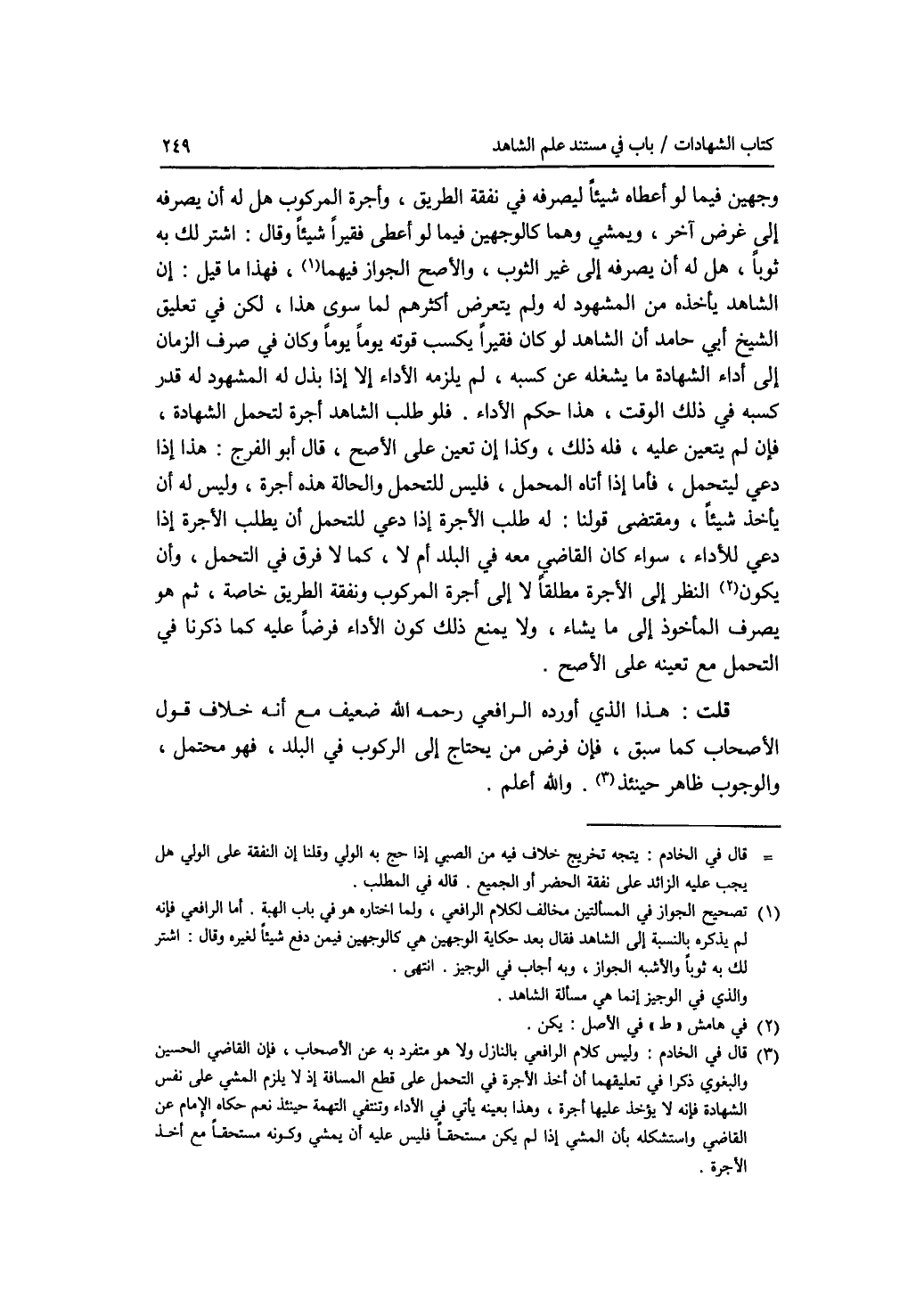 وجهين فيما لو أعطاه شيئا ليصرفه في نفقة الطريق، وأجرة المركوب هل له أن يصرفه إلى غرض آخر، ويمشي وهما كالوجهين فيما لو أعطى فقيرا شيئا وقال: اشتر لك به ثوبا، هل له أن يصرفه إلى غير الثوب، والاصح الجواز فيهما، فهذا ما قيل: إن الشاهد يأخذه من المشهود له ولم يتعرض أكثرهم لما سوى هذا، لكن في تعليق الشيخ أبي حامد أن الشاهد لو كان فقيرا يكسب قوته يوما يوما وكان في صرف الزمان إلى أداء الشهادة ما يشغله عن كسبه، لم يلزمه الاداء إلا إذا بذل له المشهود له قدر كسبه في ذلك الوقت، هذا حكم الاداء. فلو طلب الشاهد أجرة لتحمل الشهادة، فإن لم يتعين عليه، فله ذلك، وكذا إن تعين على الاصح، قال أبو الفرج: هذا إذا دعي ليتحمل، فأما إذا أتاه المحمل، فليس للتحمل والحالة هذه أجرة، وليس له أن يأخذ شيئا، ومقتضى قولنا: له طلب الاجرة إذا دعي للتحمل أن يطلب الاجرة إذا دعي للاداء، سواء كان القاضي معه في البلد أم لا، كما لا فرق في التحمل، وأن يكون النظر إلى الاجرة مطلقا لا إلى أجرة المركوب ونفقة الطريق خاصة، ثم هو يصرف المأخوذ إلى ما يشاء، ولا يمنع ذلك كون الاداء فرضا عليه كما ذكرنا في التحمل مع تعينه على الاصح. قلت: هذا الذي أورده الرافعي رحمه الله ضعيف مع أنه خلاف قول الاصحاب كما سبق، فإن فرض من يحتاج إلى الركوب في البلد، فهو محتمل، والوجوب ظاهر حينئذ. والله أعلم.
