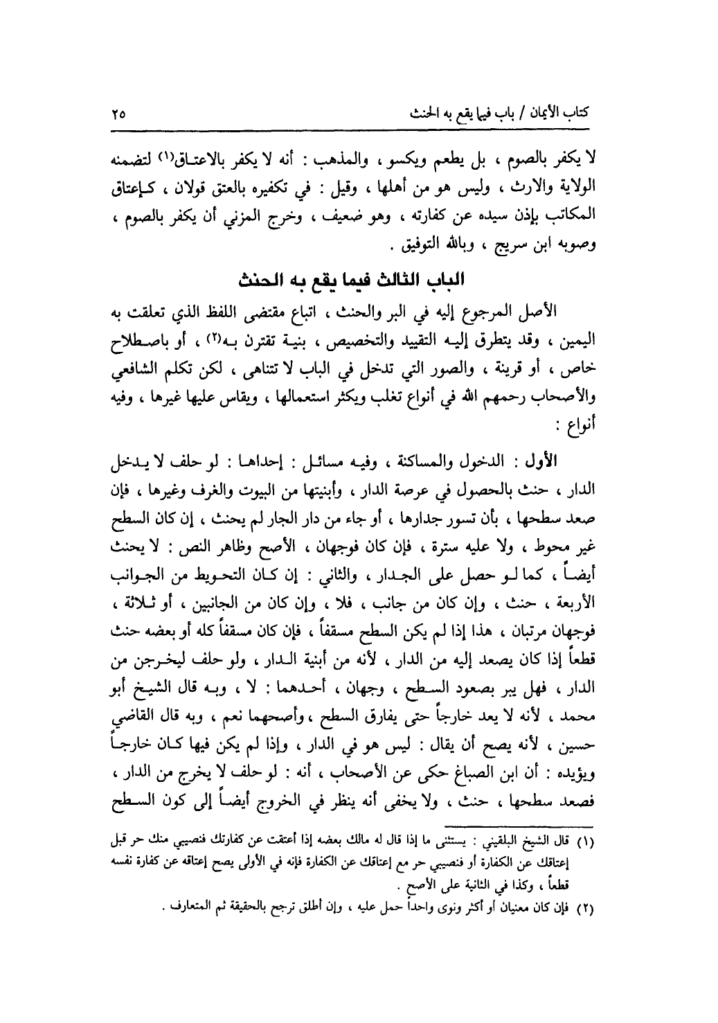 الباب الثالث : فيما يقع به الحنث الأصل المرجوع إليه في البر والحنث، اتباع مقتضى اللفظ الذي تعلقت به اليمين، وقد يتطرق إليه التقييد والتخصيص، بنية تقترن به، أو باصطلاح خاص، أو قرينة، والصور التي تدخل في الباب لا تتناهى، لكن تكلم الشافعي والاصحاب رحمهم الله في أنواع تغلب ويكثر استعمالها، ويقاس عليها غيرها، وفيه أنواع :
