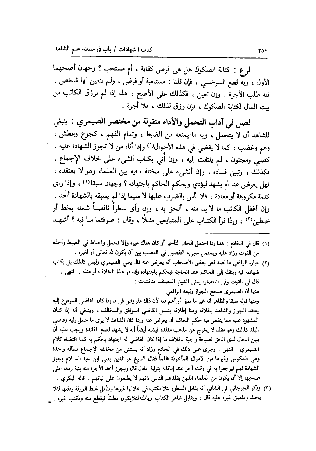فصل في آداب التحمل والأداء منقولة من مختصر الصيمري ينبغي للشاهد أن لا يتحمل، وبه ما يمنعه من الضبط، وتمام الفهم، كجوع وعطش، وهم وغضب، كما لا يقضي في هذه الاحوال، وإذا أتاه من لا تجوز الشهادة عليه، كصبي ومجنون، لم يلتفت إليه، وإن أتي بكتاب أنشئ على خلاف الاجماع، فكذلك، وتبين فساده، وإن أنشئ على مختلف فيه بين العلماء وهو لا يعتقده، فهل يعرض عنه أم يشهد ليؤدي ويحكم الحاكم باجتهاده ؟ وجهان سبقا، وإذا رأى كلمة مكروهة أو معادة، فلا بأس بالضرب عليها لا سيما إذا لم يسبقه بالشهادة أحد، وإن أغفل الكاتب ما لا بد منه، ألحق به، وإن رأى سطرا ناقصا شغله بخط أو خطين، وإذا قرأ الكتاب على المتبايعين مثلا، وقال: عرفتما ما فيه ؟ أشهد