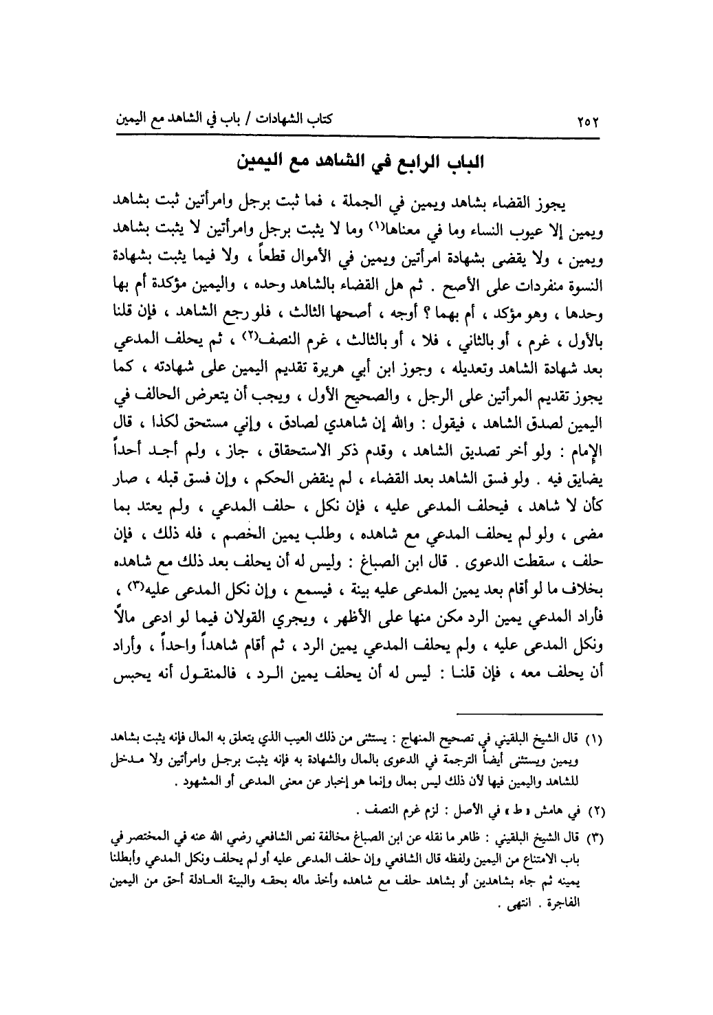 الباب الرابع : في الشاهد مع اليمين يجوز القضاء بشاهد ويمين في الجملة، فما ثبت برجل وامرأتين ثبت بشاهد ويمين إلا عيوب النساء وما في معناها، وما لا يثبت برجل وامرأتين لا يثبت بشاهد ويمين، ولا يقضى بشهادة امرأتين ويمين في الاموال قطعا، ولا فيما يثبت بشهادة النسوة منفردات على الاصح. ثم هل القضاء بالشاهد وحده، واليمين مؤكدة أم بها وحدها، وهو مؤكد، أم بهما ؟ أوجه، أصحها الثالث، فلو رجع الشاهد، فإن قلنا بالاول، غرم، أو بالثاني، فلا، أو بالثالث، غرم النصف، ثم يحلف المدعي بعد شهادة الشاهد وتعديله، وجوز ابن أبي هريرة تقديم اليمين على شهادته، كما يجوز تقديم المرأتين على الرجل، والصحيح الاول، ويجب أن يتعرض الحالف في اليمين لصدق الشاهد، فيقول: والله إن شاهدي لصادق، وإني مستحق لكذا، قال الامام: ولو أخر تصديق الشاهد، وقدم ذكر الاستحقاق، جاز، ولم أجد أحدا يضايق فيه. ولو فسق الشاهد بعد القضاء، لم ينقض الحكم، وإن فسق قبله، صار كأن لا شاهد، فيحلف المدعى عليه، فإن نكل، حلف المدعي، ولم يعتد بما مضى، ولو لم يحلف المدعي مع شاهده، وطلب يمين الخصم، فله ذلك، فإن حلف، سقطت الدعوى. قال ابن الصباغ: وليس له أن يحلف بعد ذلك مع شاهده بخلاف ما لو أقام بعد يمين المدعى عليه بينة، فيسمع، وإن نكل المدعى عليه، فأراد المدعي يمين الرد مكن منها على الاظهر، ويجري القولان فيما لو ادعى مالا ونكل المدعى عليه، ولم يحلف المدعي يمين الرد، ثم أقام شاهدا واحدا، وأراد أن يحلف معه، فإن قلنا: ليس له أن يحلف يمين الرد، فالمنقول أنه يحبس