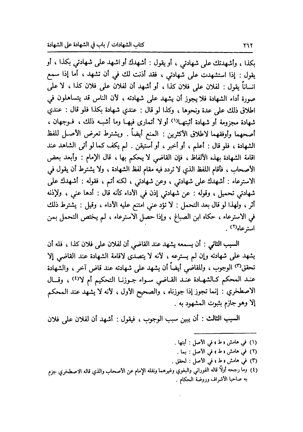 بكذا، وأشهدتك على شهادتي، أو يقول: أشهدك أو أشهد على شهادتي بكذا، أو يقول: إذا استشهدت على شهادتي، فقد أذنت لك في أن تشهد، أما إذا سمع انسانا يقول: لفلان على فلان كذا، أو أشهد أن لفلان على فلان كذا، لا على صورة أداء الشهادة، فلا يجوز أن يشهد على شهادته، لان الناس قد يتساهلون في إطلاق ذلك على عدة ونحوها، وكذا لو قال: عندي شهادة بكذا فلو قال: عندي شهادة مجزومة أو شهادة أثبتها أو لا أتمارى فيها وما أشبه ذلك، فوجهان، أصحهما وأوفقهما لاطلاق الاكثرين: المنع أيضا. ويشترط تعرض الاصل للفظ الشهادة، فلو قال: أعلم، أو أخبر، أو أستيقن، لم يكف كما لو أتى الشاهد عند إقامة الشهادة بهذه الالفاظ، فإن القاضي لا يحكم بها، قال الامام: وأبعد بعض الاصحاب، فأقام اللفظ الذي لا تردد فيه مقام لفظ الشهادة، ولا يشترط أن يقول في الاسترعاء: أشهدك على شهادتي، وعن شهادتي، لكنه أتم، فقوله: أشهدك على شهادتي تحميل، وقوله: عن شهادتي إذن في الاداء كأنه قال: أدها عني، ولاذنه أثر، ولهذا لو قال بعد التحمل: لا تؤد عني امتنع عليه الاداء، وقيل: يشترط ذلك في الاسترعاء، حكاه ابن الصباغ، وإذا حصل الاسترعاء، لم يختص التحمل بمن استرعاه. السبب الثاني: أن يسمعه يشهد عند القاضي أن لفلان على فلان كذا، فله أن يشهد على شهادته وإن لم يسترعه، لانه لا يتصدى لاقامة الشهادة عند القاضي إلا تحقق الوجوب، وللقاضي أيضا أن يشهد على شهادته عند قا ض آخر، والشهادة عند المحكم كالشهادة عند القاضي سواء جوزنا التحكيم أم لا، وقال الاصطخري: إنما تجوز إذا جوزناه، والصحيح الاول، لانه لا يشهد عند المحكم إلا وهو جازم بثبوت المشهود به. السبب الثالث: أن يبين سبب الوجوب، فيقول: أشهد أن لفلان على فلان