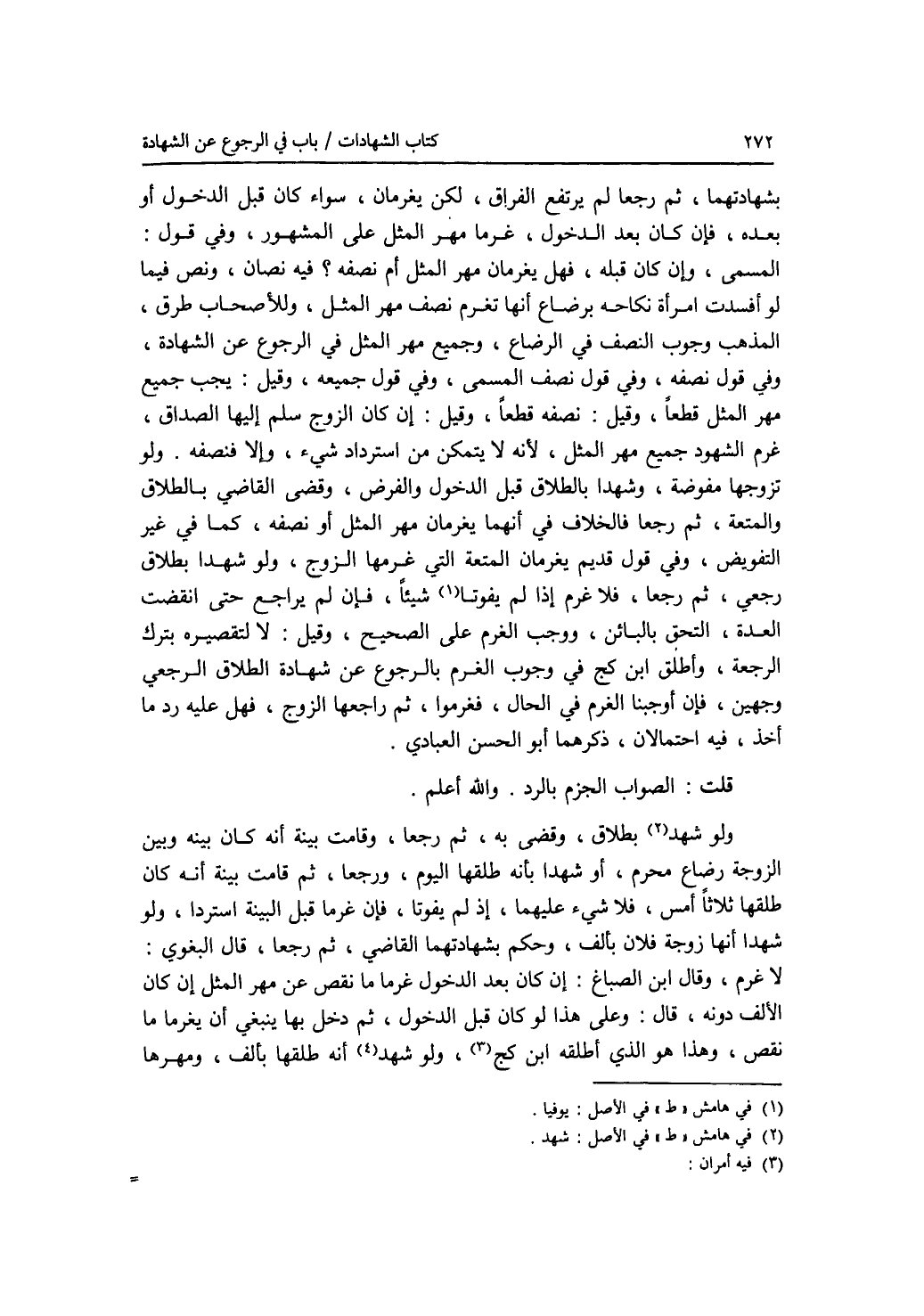 بشهادتهما، ثم رجعا لم يرتفع الفراق، لكن يغرمان، سواء كان قبل الدخول أو بعده، فإن كان بعد الدخول، غرما مهر المثل على المشهور، وفي قول: المسمى، وإن كان قبله، فهل يغرمان مهر المثل أم نصفه ؟ فيه نصان، ونص فيما لو أفسدت امرأة نكاحه برضاع أنها تغرم نصف مهر المثل، وللاصحاب طرق، المذهب وجوب النصف في الرضاع، وجميع مهر المثل في الرجوع عن الشهادة، وفي قول نصفه، وفي قول نصف المسمى، وفي قول جميعه، وقيل: يجب جميع مهر المثل قطعا، وقيل: نصفه قطعا، وقيل: إن كان الزوج سلم إليها الصداق، غرم الشهود جميع مهر المثل، لانه لا يتمكن من استرداد شئ، وإلا فنصفه، ولو تزوجها مفوضة، وشهدا بالطلاق قبل الدخول والفرض، وقضى القاضي بالطلاق والمتعة، ثم رجعا فالخلاف في أنهما يغرمان مهر المثل أو نصفه، كما في غير التفويض، وفي قول قديم يغرمان المتعة التي غرمها الزوج ولو شهدا بطلاق رجعي، ثم رجعا، فلا غرم إذا لم يفوتا شيئا، فإن لم يراجع حتى انقضت العدة، التحق بالبائن، ووجب الغرم على الصحيح، وقيل: لا لتقصيره بترك الرجعة، وأطلق ابن كج في وجوب الغرم بالرجوع عن شهادة الطلاق الرجعي وجهين، فإن أوجبنا الغرم في الحال، فغرموا، ثم راجعها الزوج، فهل عليه رد ما أخذ، فيه احتمالان، ذكرهما أو الحسن العبادي. قلت: الصواب الجزم بالرد. والله أعلم. ولو شهد بطلاق، وقضى به، ثم رجعا، وقامت بينة أنه كان بينه وبين الزوجة رضاع محرم، أو شهدا بأنه طلقها اليوم، ورجعا، ثم قامت بينة أنه كان طلقها ثلاثا أمس، فلا شئ عليهما، إذ لم يفوتا، فإن غرما قبل البينة استرداد، ولو شهدا أنها زوجة فلان بألف، وحكم بشهادتهما القاضي، ثم رجعا، قال البغوي: لا غرم، وقال ابن الصباغ: إن كان بعد الدخول غرما ما نقص عن مهر المثل إن كان الالف دونه، قال وعلى هذا لو كان قبل الدخول، ثم دخل بها ينبغي أن يغرما ما نقص، وهذا هو الذي أطلقه ابن كج. ولو شهدا أنه طلقها بألف، ومهرها