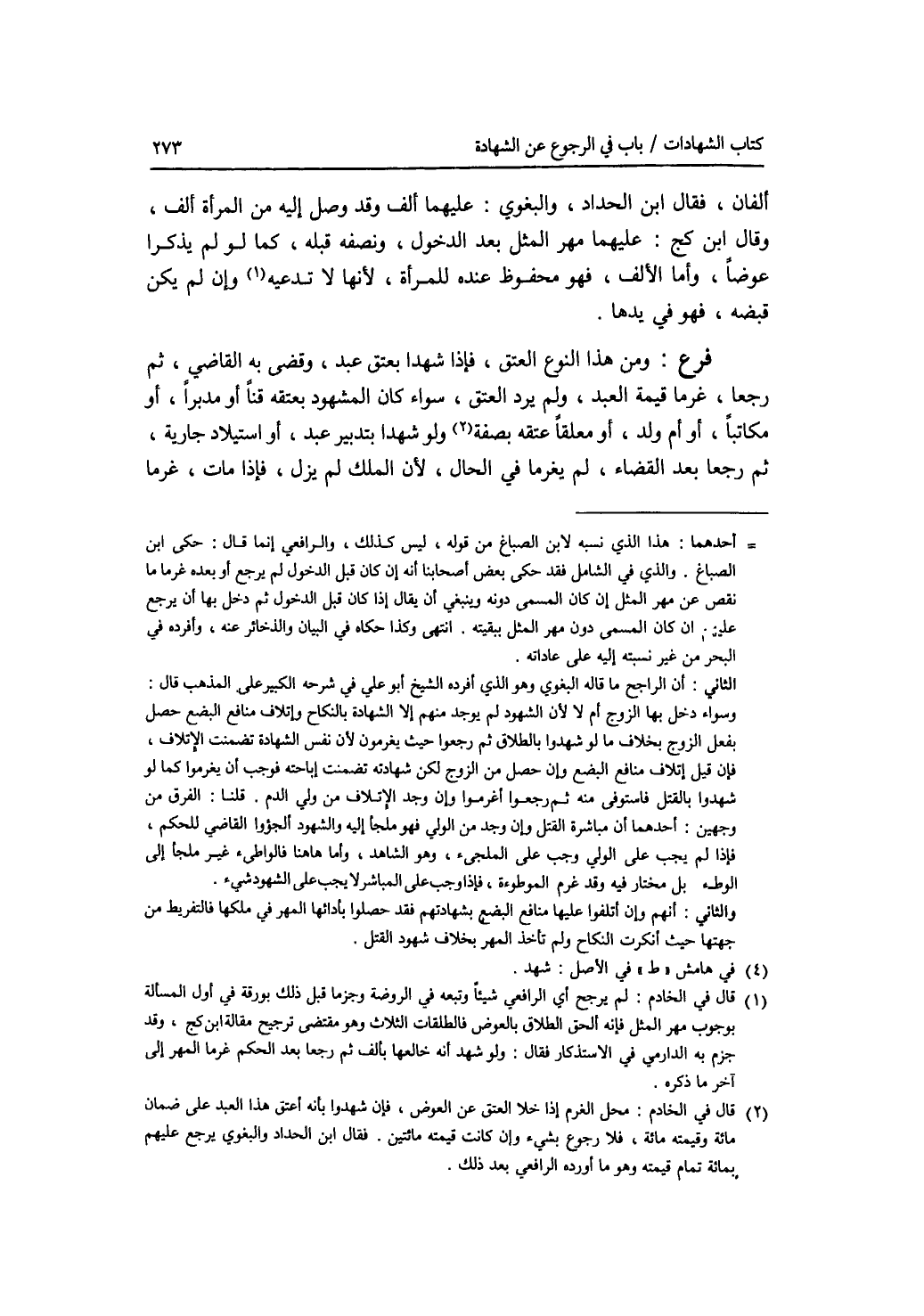 ألفان، فقال ابن الحداد، والبغوي: عليهما ألف وقد وصل إليه من المرأة ألف، وقال ابن كج: عليهما مهر المثل بعد الدخول، ونصفه قبله، كما لو يذكرا عوضا، وأما الالف، فهو محفوظ عند للمرأة، لانها لا تدعيه، وإن لم يكن قبضه، فهو في يدها. فرع ومن هذا النوع العتيق، فإذا شهدا بعتق عبد، وقضى به القاضي، ثم رجعا، غرما قيمة العبد، ولم يرد العتق، سواء كالمشهود بعتقه قنا أو مدبرا، أو مكاتبا أو أم ولد، أو معلقا عتقه بصفة، ولو شهدا بتدبير عبد، أو استيلاد جارية، ثم رجعا بعد القضاء، لم يغرما في الحال لان الملك لم يزل، فإذا مات، غرما