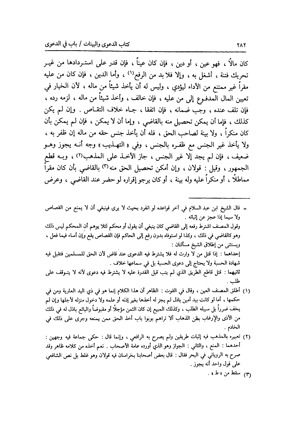 كان مالا، فهو عين، أو دين، فإن كان عينا، فإن قدر على استردادها من غير تحريك فتنة، أشغل به، وإلا فلا بد من الرفع. وأما الدين، فإن كان من عليه مقرا غير ممتنع من الاداء طالبه ليؤدي، وليس له أن يأخذ شيئا من ماله، لان الخيار في تعيين المال المدفوع إلى من عليه، فإن خالف، وأخذ شيئا من ماله، لزمه رده، فإن تلف عنده، وجب ضمانه، فإن اتفقا، جاء خلاف التقاص. وإن لم يكن كذلك، فإما أن يمكن تحصيل منه بالقاضي، وإما أن لا يمكن، فإن لم يمكن بأن كان منكرا، ولا بينة لصاحب الحق، فله أن يأخذ جنس حقه من ماله إن ظفر به، ولا يأخد غير الجنس مع ظفره بالجنس، وفي التهذيب وجه أنه يجوز وهو ضعيف، فإن لم يجد إلا غير الجنس، جاز الاخذ على المذهب، وبه قطع الجمهور، وقيل: قولان، وإن أمكن تحصيل الحق بالقاضي بأن كان مقرا مماطلا، أو منكرا عليه وله بينة، أو كان يرجو إقراره لو حضر عند القاضي وعرض