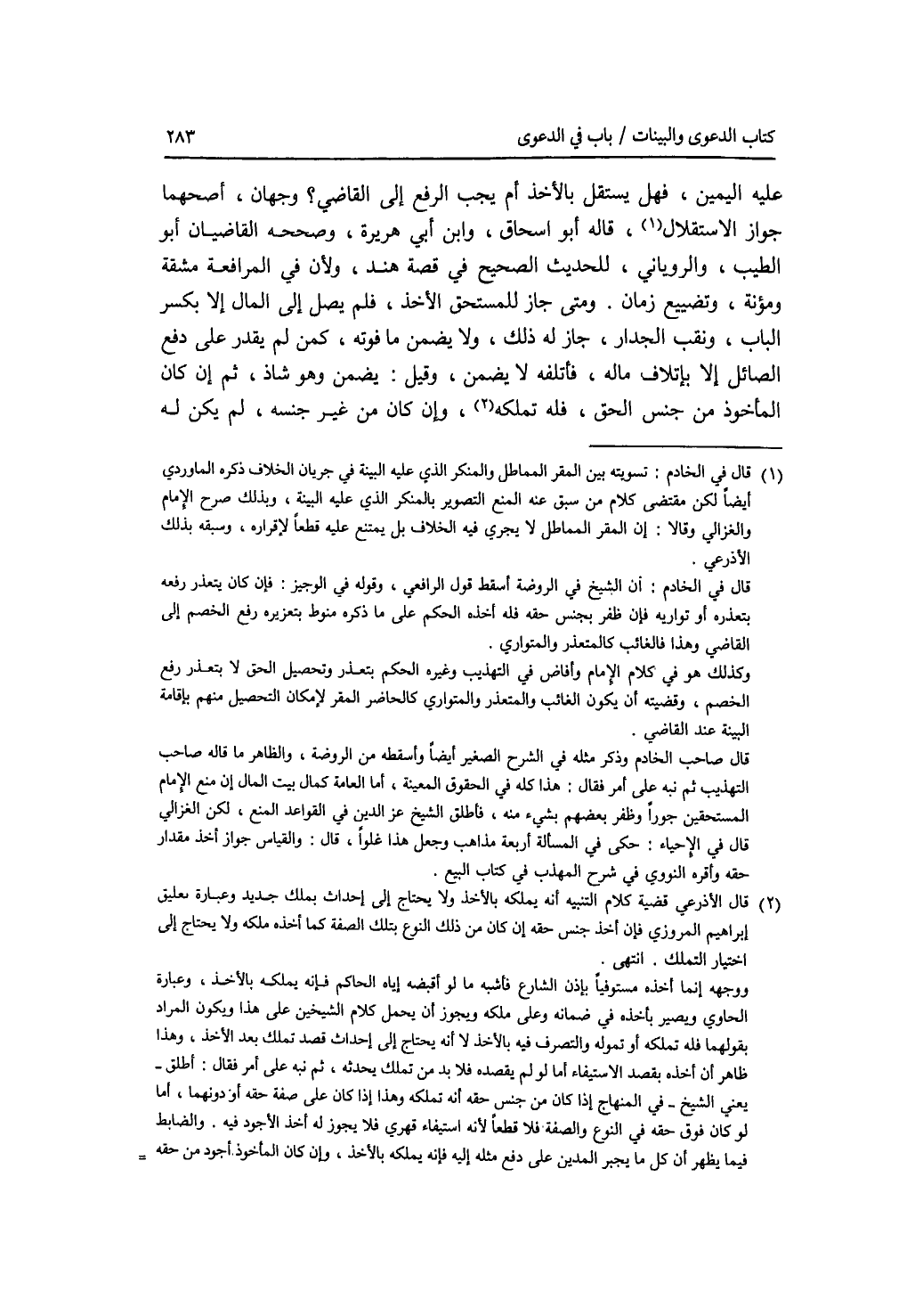 عليه اليمين، فهل يستقل بالاخذ أم يجب الرفع إلى القاضي ؟ وجهان، أصحهما جواز الاستقلال، قاله أبو إسحق، وابن أبي هريرة، وصححه القاضيان أبو الطيب والرمياني، للحديث الصحيح في قصة هند، ولان في المرافعة مشقة ومؤنة، وتضييع زمان. ومتى جاز للمستحق الاخذ، فلم يصل إلى المال إلا بكسر الباب، ونقب الجدار، جاز له ذلك، ولا يضمن ما فوته، كمن لم يقدر على دفع الصائل إلا بإتلاف ماله، فأتلفه لا يضمن، وقيل: يضمن وهو شاذ، ثم إن كان المأخوذ من جنس الحق فله تملكه، وإن كان من غير جنسه، لم يكن له