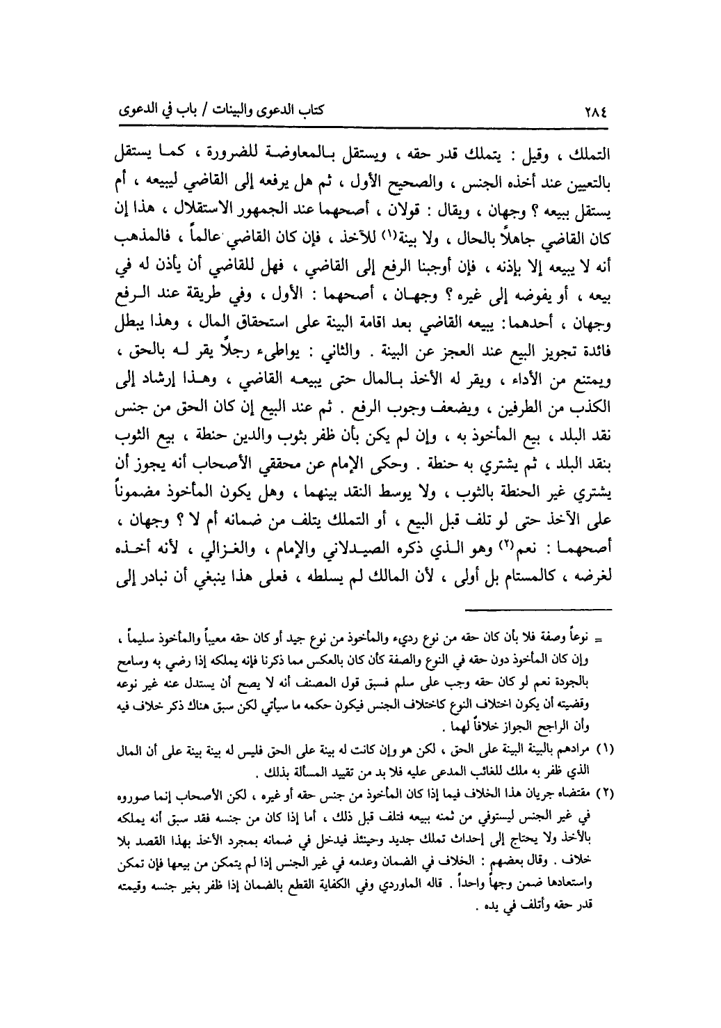 التملك، وقيل: يتملك قدر حقه، ويستقل بالمعاوضة للضرورة، كما يستقل بالتعيين عند أخذه الجنس، والصحيح الاول، ثم هل يرفعه إلى القاضي ليبيعه، أم يستقل ببيعه ؟ وجهان، ويقال: قولان، أصحهما عند الجمهور الاستقلال، هذا إن كان القاضي جاهلا بالحال، ولا بينة للاخذ، فإن كان القاضي عالما، فالمذهب أنه لا يبيعه إلا بإذنه، فإن أوجبنا الرفع إلى القاضي، فهل للقاضي أن يأذن له في بيعه، أو يفوضه إلى غيره ؟ وجهان، أصحهما: الاول، وفي طريقة عند الرفع وجهان، أحدهما: يبيعه القاضي بعد إقامة البينة على استحقاق المال، وهذا يبطل فائدة تجويز البيع عند العجز عن البينة. والثاني: يواطئ رجلا يقر له بالحق، ويمتنع من الاداء، ويقر له الاخذ بالمال حتى يبيعه القاضي، وهذا إرشاد إلى الكذب من الطرفين، ويضعف وجوب الرفع. ثم عند البيع إن كان الحق من جنس نقد البلد، بيع المأخوذ به، وإن لم يكن بأن ظفر بثوب والدين حنطة، بيع الثوب بنقد البلد، ثم يشتري به حنطة. وحكى الامام عن محققي الاصحاب أنه يجوز أن يشتري غير الحنطة بالثوب، ولا يوسط النقد بينهما، وهل يكون المأخوذ مضمونا على الاخذ حتى لو تلف قبل البيع، أو التملك بتلف من ضمانه أم لا ؟ وجهان، أصحهما: نعم وهو الذي ذكره الصيدلاني والامام، والغزالي، لانه أخذه لغرضه، كالمستام بل أولى، لان المالك لم يسلطه فعلى هذا ينبغي أن نبادر إلى