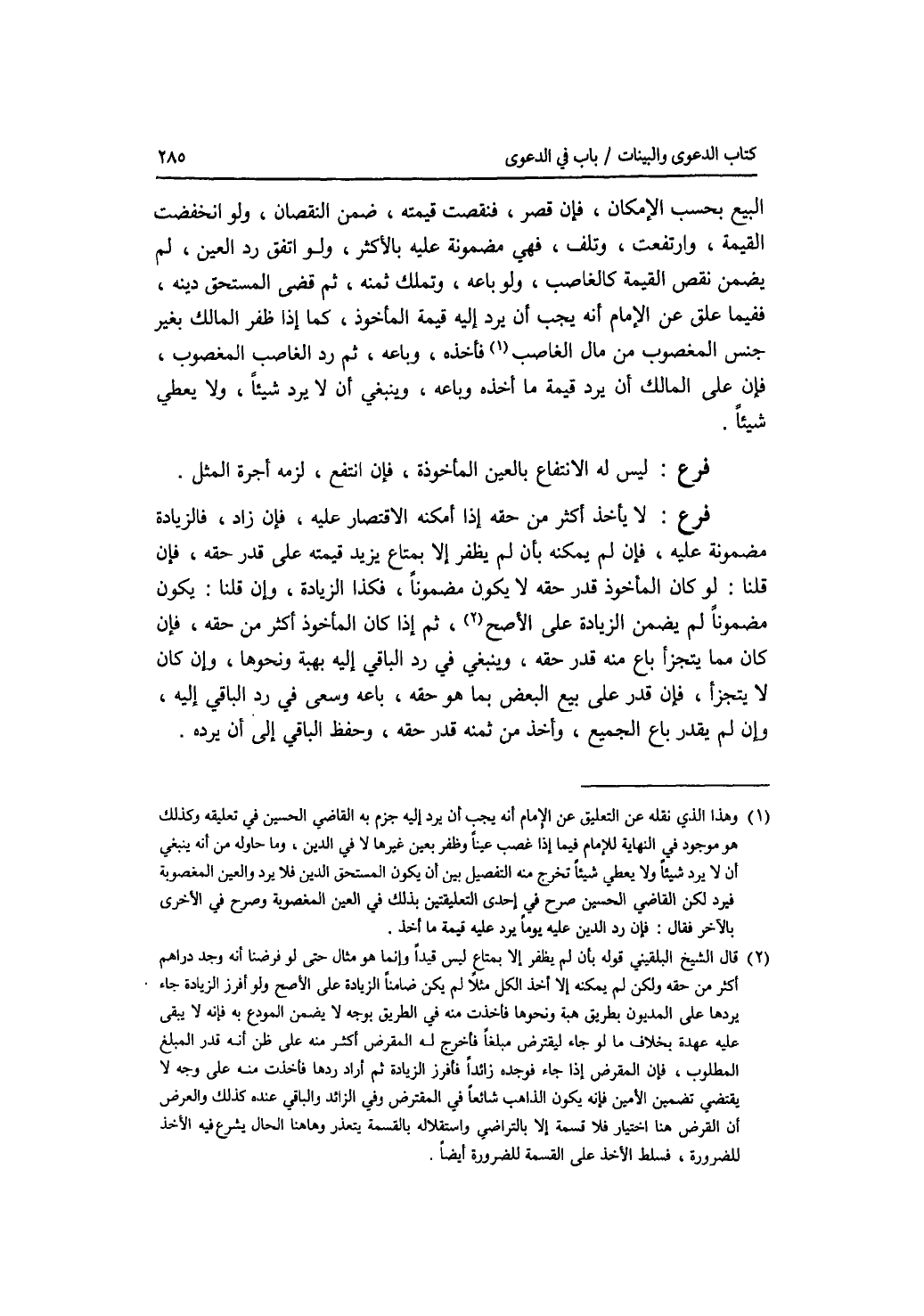 البيع بحسب الامكان، فإن قصر، فنقصت قيمته، ضمن النقصان، ولو انخفضت القيمة، وارتفعت، وتلف، فهي مضمونة عليه بالاكثر، ولو اتفق رد العين، لم يضمن نقص القيمة كالغاصب، ولو باعه، وتملك ثمنه، ثم قضى المستحق دينه، ففيما علق عن الامام أنه يجب أن يرد إليه قيمة المأخوذ، كما إذا ظفر المالك بغير جنس المغصوب من مال الغاصب، فأخذه، وباعه، ثم رد الغاصب المغصوب، فإن على المالك أن يرد قيمة ما أخذه وباعه، وينبغي أن لا يرد شيئا ولا يعطي شيئا. فرع ليس له الانتفاع بالعين المأخوذة، فإن انتفع، لزمه أجرة المثل. فرع لا يأخذ أكثر من حقه إذا أمكنه الاقتصار عليه، فإن زاد، فالزيادة مضمونة عليه، فإن لم يمكنه بأن لم يظفر إلا بمتاع يزيد قيمته على قدر حقه، فإن قلنا: لو كان المأخوذ قدر حقه لا يكون مضمونا، فكذا الزيادة، وإن قلنا: يكون مضمونا لم يضمن الزيادة على الاصح، ثم إذا كان المأخوذ أكثر من حقه، فإن كان مما يتجزأ باع منه قدر حقه، وسعى في رد الباقي إليه بهبة ونحوها، وإن كان لا يتجزأ، فإن قدر على بيع البعض بما هو حقه، باعه وسعى في رد الباقي إليه، وإن لم يقدر باع الجميع، وأخذ من ثمنه قدر حقه، وحفظ الباقي إلى أن يرده.