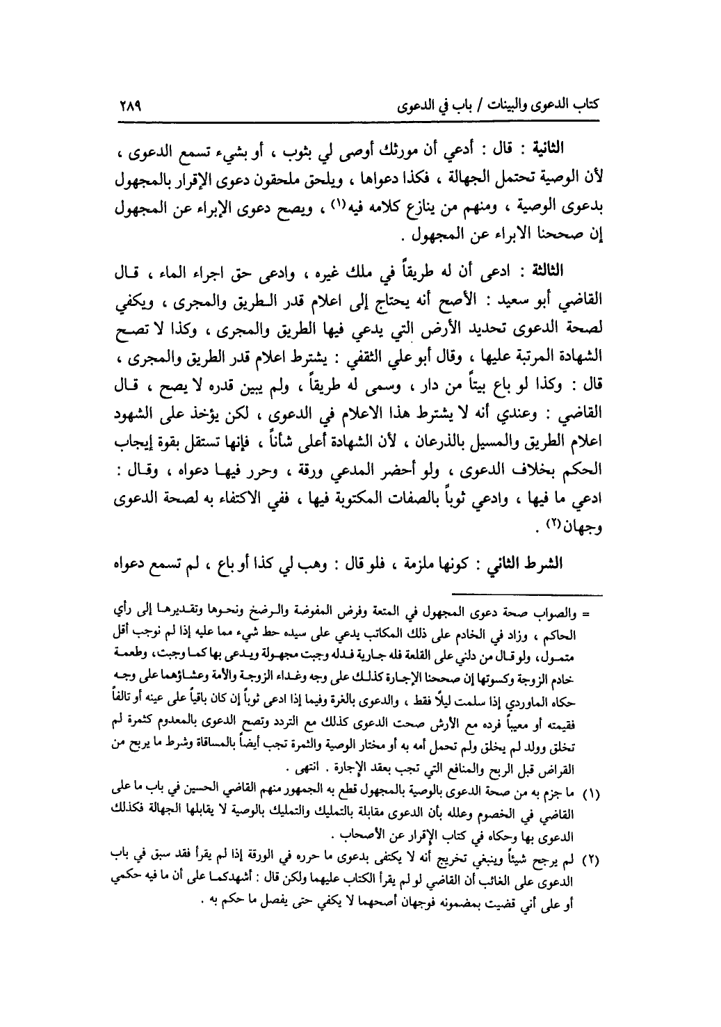 الثانية: قال: أدعي أن مورثك أوصى لي بثوب، أو بشئ تسمع الدعوى، لان الوصية تحتمل الجهالة، فكذا دعواها، وألحق ملحقون دعوى الاقرار بالمجهول بدعوى الوصية، ومنهم من ينازع كلامه فيه، ويصح دعوى الابراء عن المجهول إن صححنا الابراء عن المجهول. الثالثة: ادعى أن له طريقا في ملك غيره، وادعى حق إجراء الماء، قال القاضي أبو سعد: الاصح أنه لا يحتاج إلى إعلام قدر الطريق والمجرى، ويكفي لصحة الدعوى تحديد الارض التي يدعي فيها الطريق والمجرى، وكذا لا تصح الشهادة المرتبة عليها، وقال أبو علي الثقفي: يشترط إعلام قدر الطريق والمجرى، وقال: وكذا لو باع بيتا من دار، وسمى له طريقا، ولم يبين قدره لا يصح، قال القاضي: وعندي أنه لا يشترط هذا الاعلام في الدعوى، لكن يؤخذ على الشهود إعلام الطريق والمسيل بالذرعان، لان الشهادة أعلى شأنا، فإنها تستقل بقوة إيجاب الحكم بخلاف الدعوى، ولو أحضر المدعي ورقة، وحرر فيها دعواه، وقال: أدعي ما فيها، وأدعي ثوبا بالصفات المكتوبة فيها، ففي الاكتفاء به لصحة الدعوى وجهان. الشرط الثاني: كونها ملزمة، فلو قال: وهب لي كذا أو باع، لم تسمع دعواه