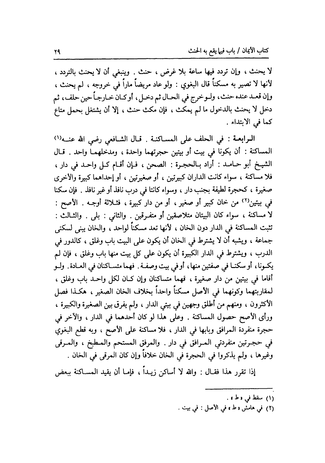 لا يحنث، وإن تردد فيها ساعة بلا غرض، حنث. وينبغي أن لا يحنث بالتردد، لانها لا تصير به مسكنا قال البغوي: ولو عاد مريضا مارا في خروجه، لم يحنث، وإن قعد عنده حنث، ولو خرج في الحال ثم دخل، أو كان خارجا حين حلف، ثم دخل لا يحنث بالدخول ما لم يمكث، فان مكث حنث، إلا أن يشتغل بحمل متاع كما في الابتداء. الرابعة: في الحلف على المساكنة. قال الشافعي رحمه الله: المساكنة: أن يكونا في بيت أو بيتين حجرتهما واحدة، ومدخلهما واحد. قال الشيخ أبو حامد: أراد بالحجرة: الصحن، فإن أقام كل واحد في دار، فلا مساكنة، سواء كانت الداران كبيرتين، أو صغيرتين، أو إحداهما كبيرة والاخرى صغيرة، كحجرة لطيفة بجنب دار، وسواء كانتا في درب نافذ أو غير نافذ. فإن سكنا في بيتين من خان كبير أو صغير، أو من دار كبيرة، فثلاثة أوجه. الاصح: لا مساكنة، سواء كان البيتان متلاصقين أو متفرقين، والثاني: بلى. والثالث: تثبت المساكنة في الدار دون الخان، لانها تعد مسكنا لواحد، والخان يبنى لسكني جماعة، ويشبه أن لا يشترط في الخان أن يكون على البيت باب وغلق، كالدور في الدرب، ويشترط في الدار الكبيرة أن يكون على كل بيت منها باب وغلق، فإن لم يكونا، أو سكنا في صفتين منها، أو في بيت وصفة، فهما متساكنان في العادة. ولو أقاما في بيتين من دار صغيرة، فهما متساكنان وإن كان لكل واحد باب وغلق، لمقاربتهما وكونهما في الاصل مسكنا واحدا بخلاف الخان الصغير، وهكذا فصل الاكثرون، ومنهم من أطلق وجهين في بيتي الدار، ولم يفرق بين الصغيرة والكبيرة، ورأى الاصح حصول المساكنة. وعلى هذا لو كان أحدهما في الدا، والآخر في حجرة منفردة المرافق وبابها في الدار، فلا مساكنة على الاصح، وبه قطع البغوي في حجرتين منفردتي المرافق في دار. والمرفق المستحم والمطبخ، والمرقى وغيرها، ولم يذكروا في الحجرة في الخان خلافا وإن كان المرقى في الخان. إذا تقرر هذا فقال: والله لا أساكن زيدا، فإما أن يقيد المساكنة ببعض