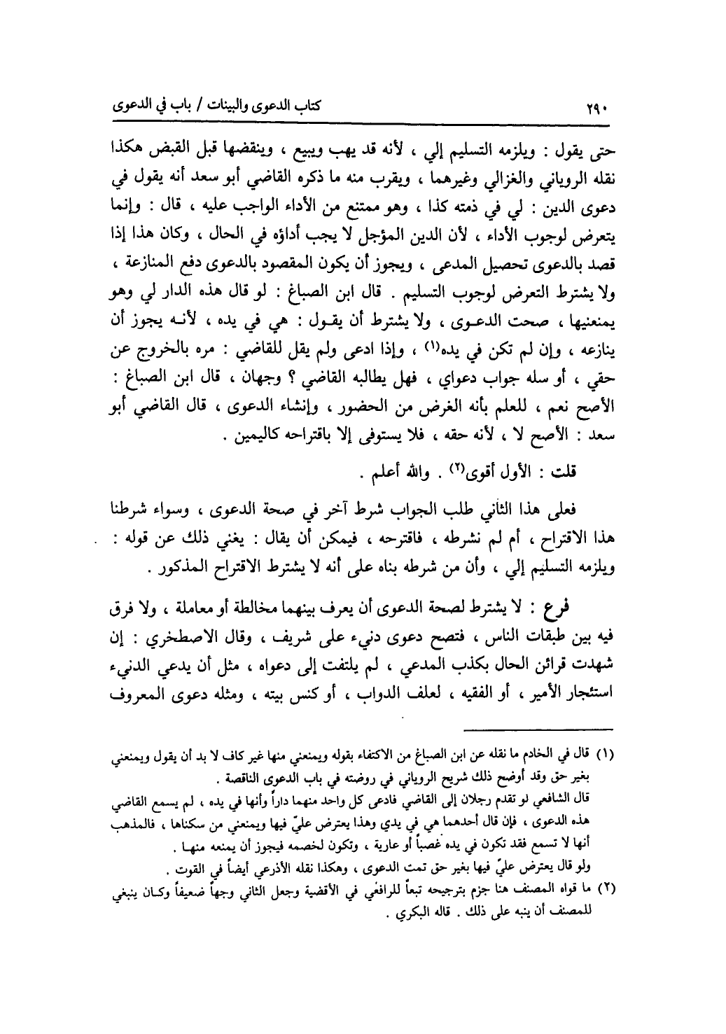 حتى يقول: ويلزمه التسليم إلي، لانه قد يهب ويبيع، وينقضها قبل القبض هكذا نقله الروياني والغزالي وغيرهما، ويقرب منه ما ذكره القاضي أبو سعد أنه يقول في دعوى الدين: لي في ذمته كذا، وهو ممتنع من الاداء الواجب عليه، قال: وإنما يتعرض لوجوب الاداء، لان الدين المؤجل لا يجب اداؤه في الحال، وكان هذا إذا قصد بالدعوى تحصيل المدعى، ويجوز أن يكون المقصود بالدعوى دفع المنازعة، ولا يشترط التعرض لوجوب التسليم. قال ابن الصباغ: لو قال هذه الدار لي وهو يمنعنيها، صحت الدعوى، ولا يشترط أن يقول: هي في يده، لانه يجوز أن ينازعه، وإن لم تكن في يده، وإذا ادعى ولم يقل للقاضي: مره بالخروج عن حقي، أو سله جواب دعواي، فهل يطالبه القاضي ؟ وجهان، قال ابن الصباغ: الاصح نعم، للعلم بأنه الغرض من الحضور، وإنشاء الدعوى، قال القاضي أبو سعد: الاصح لا، لانه حقه، فلا يستوفى إلا باقتراحه كاليمين. قلت: الاول أقوى. والله أعلم فعلى هذا الثاني طلب الجواب شرط آخر في صحة الدعوى، وسواء شرطنا هذا الاقتراح، أم لم نشرطه، فاقترحه، فيمكن أن يقال: يغني ذلك عن قوله: ويلزمه التسليم إلي، وأن من شرطه بناه على أنه لا يشترط الاقتراح المذكور. فرع لا يشترط لصحة الدعوى أن يعرف بينهما مخالط أو معاملة، ولا فرق فيه بين طبقات الناس، فتصح دعوى دنئ على شريف، وقال الاصطخري: إن شهدت قرائن الحال بكذب المدعي، لم يلتفت إلى دعواه، مثل أن يدعي الدنئ استئجار الامير، أو الفقيه، لعلف الدواب، أو كنس بيته، ومثله دعوى المعروف