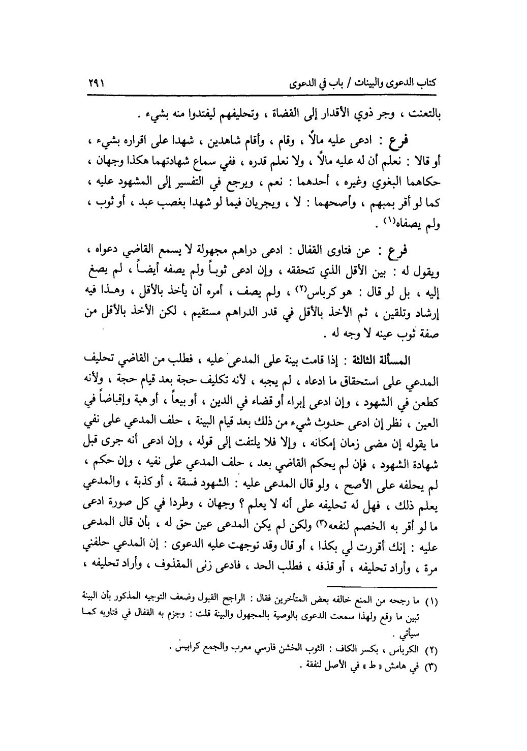 بالتعنت، وجر ذوي الاقدار إلى القضاة، وتحليفهم ليفتدوا منه بشئ. فرع ادعى عليه مالا، وقام، وأقام شاهدين، شهدا على إقراره بشئ، أو قالا: نعلم أن له عليه مالا، ولا نعلم قدره، ففي سماع شهادتهما هكذا وجهان، حكاهما البغوي وغيره، أحدهما: نعم، ويرجع في التفسير إلى المشهود عليه، كما لو أقر بمبهم، وأصحهما: لا، ويجريان فيما لو شهدا بغصب عبد، أو ثوب، ولم يصفاه. فرع عن فتاوي القفال: ادعى دراهم مجهولة لا يسمع القاضي دعواه، ويقول له: بين الاقل الذي تتحققه، وإن ادعى ثوبا ولم يصفه أيضا، لم يصغ إليه، بل لو قال: هو كرباس، ولم يصف، أمره أن يأخذ بالاقل، وهذا فيه أرشاد وتلقين، ثم الاخذ بالاقل في قدر الدراهم مستقيم، لكن الاخذ بالأقل من صفة الثوب عينه لا وجه له