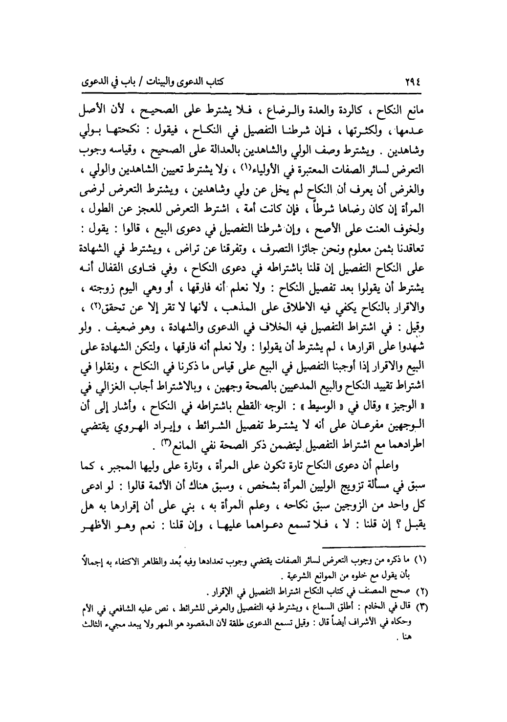 مانع النكاح، كالردة والعدة والرضاع، فلا يشترط على الصحيح، لان الاصل عدمها، ولكثرتها، فان شرطنا التفصيل في النكاح، فيقول: نكحتها بولي وشاهدين. ويشترط وصف الولي والشاهدين بالعدالة على الصحيح، وقياسه وجوب التعرض لسائر الصفات المعتبرة في الاولياء (1)، ولا يشترط تعيين الشاهدين والولي، والغرض ان يعرف ان النكاح لم يخل عن ولي وشاهدين، ويشترط التعرض لرضى المرأة إن كان رضاها شرطا، فإن كانت امة، اشترط التعرض للعجز عن الطول، ولخوف العنت على الاصح، وان شرطنا التفصيل في دعوى البيع، قالوا: يقول: تعاقدنا بثمن معلوم ونحن جائزا التصرف، وتفرقنا عن تراض، ويشترط في الشهادة على النكاح التفصيل ان قلنا باشتراطه في دعوى النكاح، وفي فتاوى القفال انه يشترط ان يقولوا بعد تفصيل النكاح: ولا نعلم انه فارقها، أو وهي اليوم زوجته، والاقرار بالنكاح يكفي فيه الاطلاق على المذهب، لانها لا تقر الا عن تحقق (2)، وقيل: في اشتراط التفصيل فيه الخلاف في الدعوى والشهادة، وهو ضعيف. ولو شهدوا على اقرارها، لم يشترط ان يقولوا: ولا نعلم انه فارقها، ولتكن الشهادة على البيع والاقرار ادا اوجبنا التفصيل في البيع على قياس ما ذكرنا في النكاح، ونقلوا في اشتراط تقييد النكاح والبيع المدعيين بالصحة وجهين، وبالاشتراط اجاب الغزالي في " الوجيز " وقال في " الوسيط ": الوجه القطع باشتراطه في النكاح، واشار الى ان الوجهين مفرعان على انه لا يشترط بفصيل الشرائط، وايراد الهروي يقتضي اطرادهما مع اشتراط التفصيل ليتضمن ذكر الصحة نفي المانع (3). واعلم أن دعوى النكاح تارة تكون على المرأة، وتارة على وليها المجبر، كما سبق في مسألة تزويج الوليين المرأة بشخص، وسبق هناك أن الائمة قالوا: لو ادعى كل واحد من الزوجين سبق نكاحه، وعلم المرأة به، بني على أن إقرارها به هل يقبل ؟ إن قلنا: لا، فلا تسمع دعواهما عليها، وإن قلنا: نعم وهو الاظهر