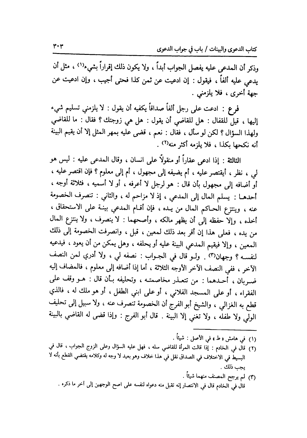 الثالثة : إذا ادعى عقارا أو منقولا على إنسان، وقال المدعى عليه: ليس هو لي، نظر، أيقتصر عليه، أم يضيفه إلى مجهول، أم إلى معلوم ؟ فإن اقتصر عليه، أو أضافه إلى مجهول بأن قال: هو لرجل لا أعرفه، أو أسميه، فثلاثة أوجه، أحدهما: يسلم المال إلى المدعي، إذ لا مزاحم له، والثاني: تنصرف الخصومة عنه، وينتزع الحاكم المال من يده، فإن أقام المدعي بينة على الاستحقاق، أخذه، وإلا حفظه إلى أن يظهر مالكه، وأصحهما: لا ينصرف، ولا ينتزع المال من يده، فعلى هذا إن أقر بعد ذلك لمعين، قبل، وانصرفت الخصومة إلى ذلك المعين، وإلا فيقيم المدعي البينة عليه أو يحلفه، وهل يمكن من أن يعود، فيدعيه لنفسه ؟ وجهان. ولو قال في الجواب: نصفه لي، ولا أدري لمن النصف الآخر، ففي النصف الآخر الاوجه الثلاثة، وأما إذا أضافه إلى معلوم، فالمضاف إليه ضربان، أحدهما: من تتعذر مخاصمته، وتحليفه بأن قال: هو وقف على الفقراء، أو على المسجد الفلاني، أو على ابني الطفل، أو هو ملك له، فالذي قطع به الغزالي، والشيخ أبو الفرج أن الخصومة تنصرف عنه، ولا سبيل إلى تحليف الولي ولا طفله، ولا تغني إلا البينة، قال أبو الفرج: وإذا قضى له القاضي بالبينة