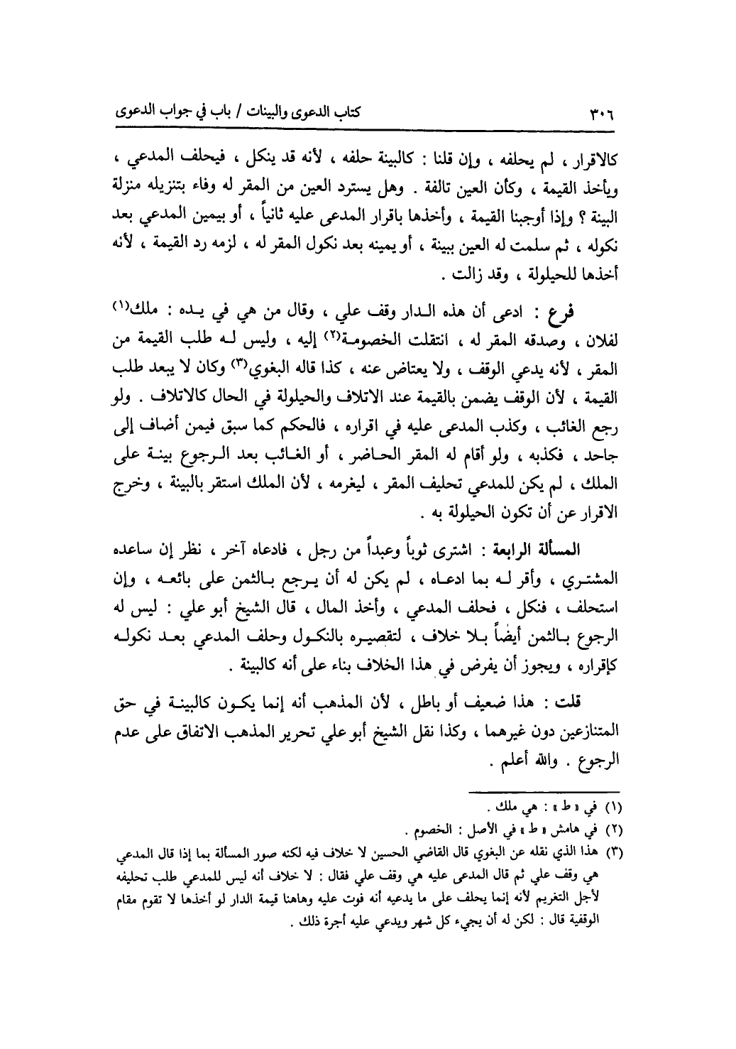 المسألة الرابعة : اشترى ثوبا وعبدا من رجل، فادعاه آخر، أن تكون الحيلولة به نظر إن ساعده المشتري، وأقر له بما ادعاه، لم يكن له أن يرجع بالثمن على بائعة، وإن استحلف، فنكل، فحلف المدعي، وأخذ المال، قال الشيخ أبو علي: ليس له الرجوع بالثمن أيضا بلا خلاف، لتقصيره بالنكول وحلف المدعي بعد نكوله كإقراره ويجوز أن يفرض في هذا الخلاف بناء على أنه كالبينة. قلت: هذا ضعيف أو باطل، لان المذهب أنه إنما يكون كالبينة في حق المتنازعين دون غيرهما، وكذا نقل الشيخ أبو علي تحرير المذهب الاتفاق على عدم الرجوع. والله أعلم.