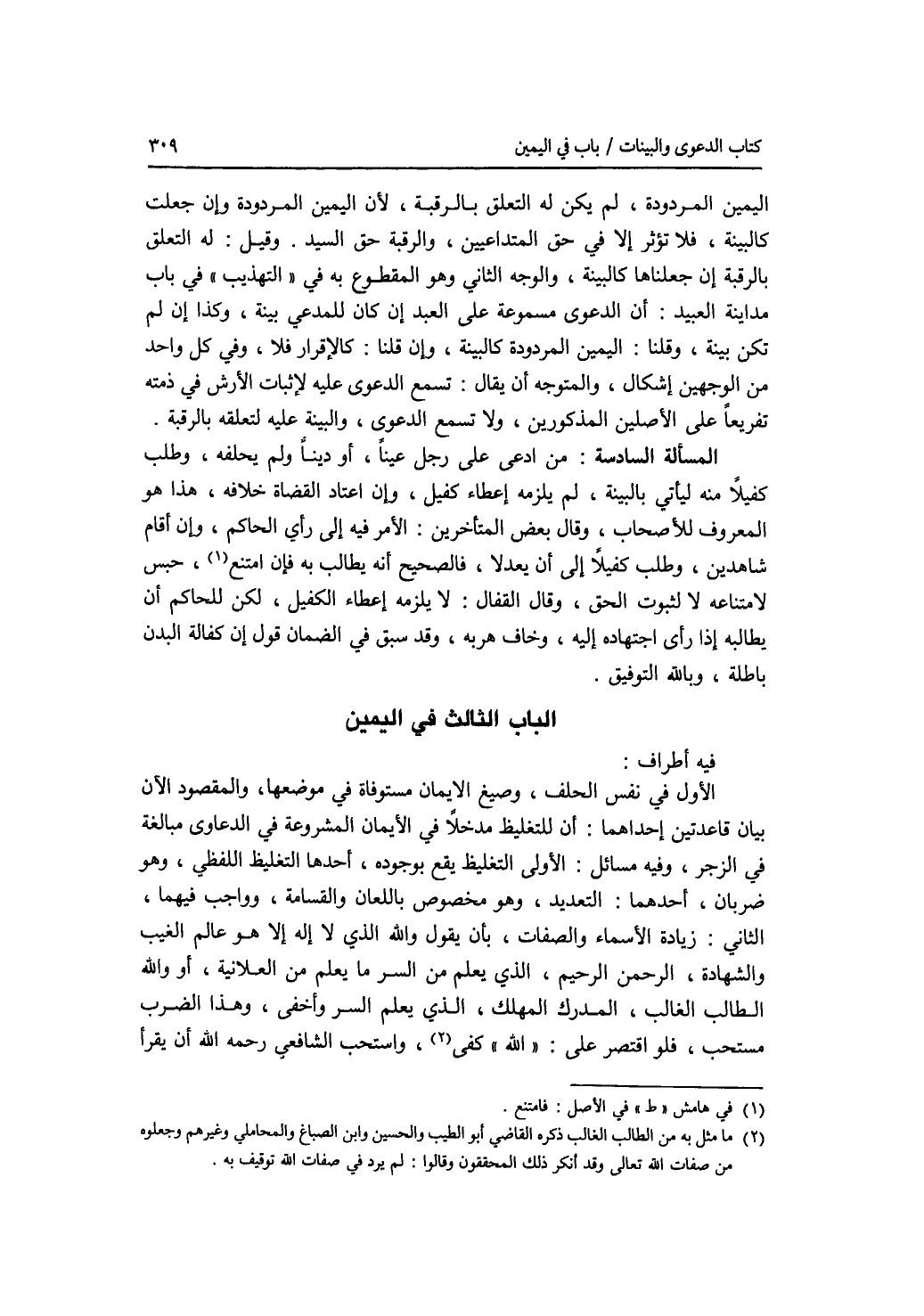 الأول : في نفس الحلف، وصيغ الايمان مستوفاة في موضعها، والمقصود الآن بيان فاعدتين إحداهما: أن للتغليظ مدخلا في الايمان المشروعة في الدعاوى مبالغة في الزجر وفيه مسائل: الاولى التغليظ يقع بوجوده، أحدها التغليظ اللفظي، وهو ضربان، أحدهما: التعديد، وهو مخصوص باللعان والقسامة، وواجب فيهما، الثاني: زيادة الاسماء والصفات، بأن يقول: والله الذي لا إله إلا هو عالم الغيب والشهادة، الرحمن الرحيم، الذي يعلم من السر ما يعلم من العلانية، أو والله الطالب الغالب، المدرك، المهلك، الذي يعلم السر وأخفى، وهذا الضرب مستحب، فلو اقتصر على: الله كفى، واستحب الشافعي رحمه الله أن يقرأ