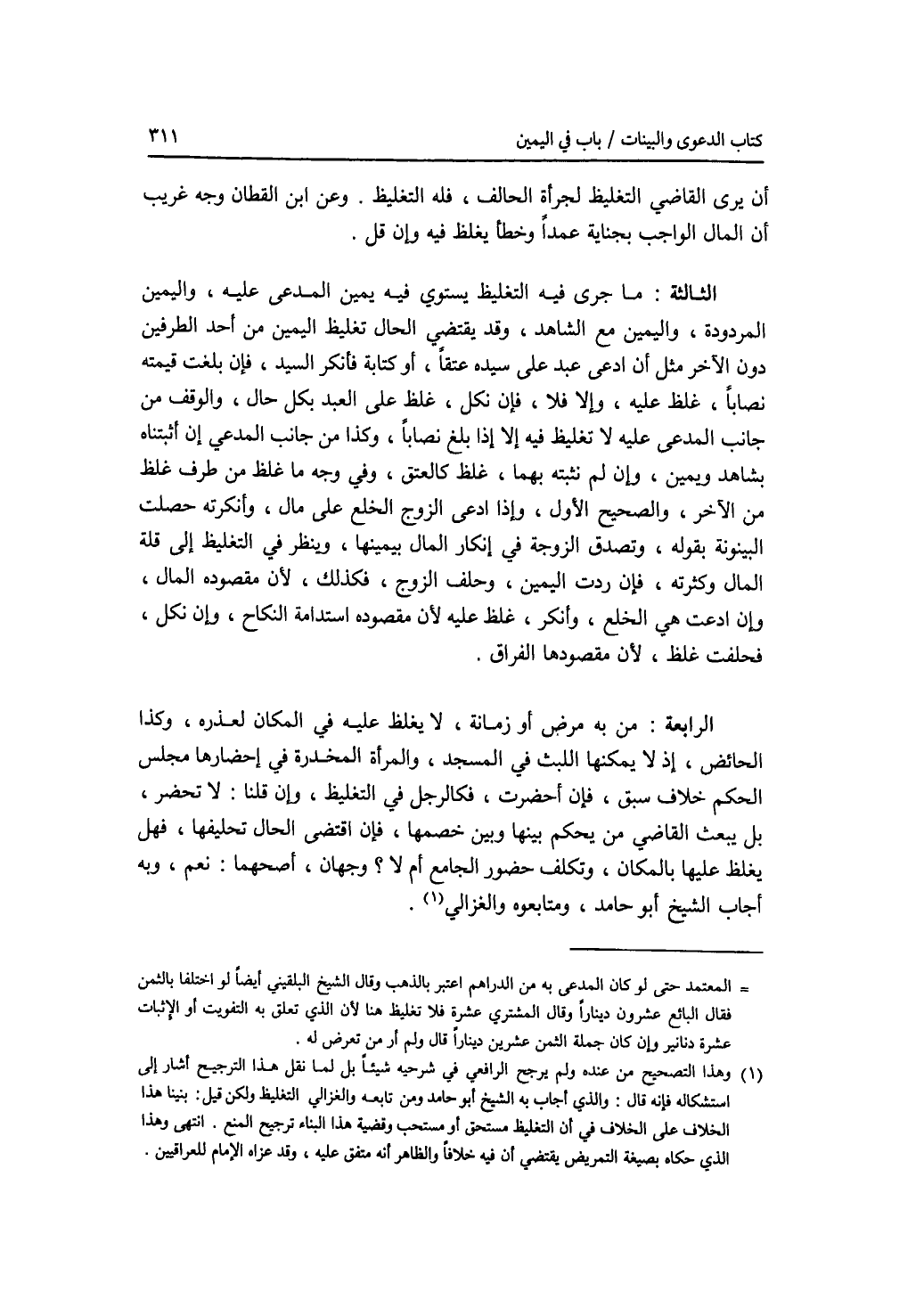 أن يرى القاضي التغليظ لجرأة الحالف، فله التغليظ. وعن ابن القطان وجه غريب أن المال الواجب بجناية عمدا وخطأ يغلظ فيه وإن قل. الثالثة: ما جرى فيه التغليظ يستوي فيه يمين المدعى عليه، واليمين المردودة، واليمين مع الشاهد، وقد يقتضي الحال تغليظ اليمين من أحد الطرفين دون الآخر مثل ان ادعى عبد على سيده عتقا، أو كتابة فأنكر السيد، فإن بلغت قيمته نصابا، غلظ عليه، وإلا فلا، فإن نكل، غلظ على العبد بكل حال، والوقف من جانب المدعى عليه لا تغليظ فيه إلا إذا بلغ نصابا، وكذا من جانب المدعي إن أثبتناه بشاهد ويمين، وإن لم نثبته بهما، غلظ كالعتق، وفي وجه ما غلظ من طرف غلظ من الآخر، والصحيح الاول، وإذا ادعى الزوج الخلع على مال، وأنكرته حصلت البينونة بقوله، وتصدق الزوجة في إنكار الما بيمينها، وينظر في التغليظ إلى قلة المال وكثرته، فإن ردت اليمين، وحلف الزوج، فكذلك، لان مقصوده المال، وإن ادعت هي الخلع، وأنكر، غلظ عليه، لا مقصوده استدامة النكاح، وإن نكل، فحلفت غلظ، لان مقصودها الفراق. الرابعة: من به مرض أو زمانة، لا يغلظ عليه في المكان لعذره، وكذا الحائض، إذ لا يمكنها اللبث في المسجد، والمرأة المخدرة في إحضارها مجلس الحكم خلاف سبق، فإن أحضرت، فكالرجل في التغليظ، وإن قلنا: لا تحضر، بل يبعث القاضي من يحكم بينها وبين خصمها، فإن اقتضى الحال تحليفها، فهل يغلظ عليها بالمكان، وتكلف حضور الجامع أم لا ؟ وجهان، أصحهما: نعم، وبه أجاب الشيخ أبو حامد، ومتابعوه والغزالي.
