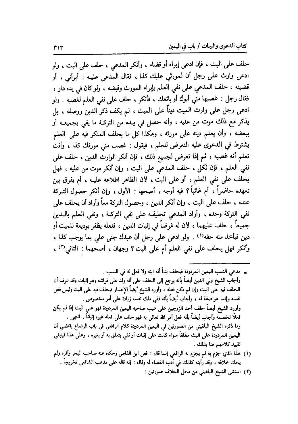 حلف على البت، فإن ادعى إبراء أو قضاء، وأنكر المدعي، حلف على البت، ولو ادعى على وارث على رجل أن لمورثي عليك كذا، فقال المدعى عليه: أبرأني، أو قضيته، حلف المدعي على نفي العلم بإبراء المورث وقبضه، ولو كان في يده دار، فقال رجل: غصبها مني أبوك أو بائعك، فأنكر، حلف على نفي العلم لغصبه، ولو ادعى رجل وارث الميت دينا على الميت، لم يكف ذكر الدين ووصفه، بل يذكر مع ذلك موت من عليه، وأنه حصل في يده من التركة ما يفي بجميعه أو ببعضه، وأن يعلم دينه على مورثه، وهكذا كل ما يحلف المنكر فيه على العلم يشترط في الدعوى عليه التعرض للعلم، فيقول: غصب منمورثك كذا، وأنت تعلم أنه غصبه، ثم إذا تعرض لجميع ذلك، فإن أنكر الوارث الدين، حلف على نفي العلم، فإن نكل، حلف المدعي على البت، وإن أنكر موت من عليه، فهل يحلف على نفي العلم، أم على البت، لان الظاهر اطلاعه عليه، أم يفرق بين تعهده حاضرا، أم غائبا ؟ فيه أوجه، أصحها: الاول، وإن أنكر حصول التركة عنده، حلف على البت، وإن أنكر الدين، وحصول التركة معا وأراد أن يحلف على نفي التركة وحده، وأراد المدعي تحليفه على نفي التركة، ونفي العلم بالدين جميعا، حلف عليهما، لان له غرضا في إثبات الدين، فلعله يظفر بوديعة للميت أو دين فيأخذ منه حقه. ولو ادعى على رجل أن عبدك جنى علي بما يوجب كذا، وأنكر فهل يحلف على نفي العلم أم على البت ؟ وجهان، أصحهما: الثاني،