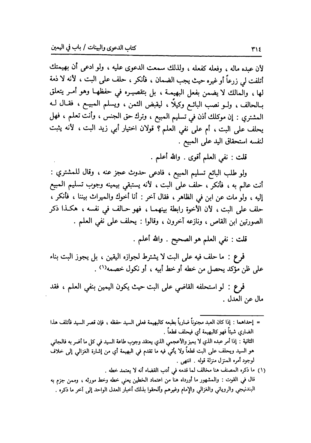 لان عبده ماله، وفعله كفعله، ولذلك سمعت الدعوى عليه، ولو ادعى أن بهيمتك أتلفت لي زرعا أو غيره حيث يجب الضمان، فأنكر، حلف على البت، لانه لا ذمة لها، والمالك لا يضمن بفعل البهيمة، بل بتقصيره في حفظها وهو أمر يتعلق بالحالف، ولو نصب البائع وكيلا، ليقبض الثمن، ويسلم المبيع، فقال له المشتري: إن موكلك أذن في تسليم المبيع، وترك حق الجنس، وأنت تعلم، فهل يحلف على البت، أم على نفي العلم ؟ قولان اختيار أبي زيد البت، لانه يثبت لنفسه استحقاق اليد على المبيع. قلت: نفي العلم أقوى. والله أعلم. ولو طلب البائع تسليم المبيع، فادعى حدوث عجز عنه، وقال للمشتري: أنت عالم به، فأنكر، حلف على البت، لانه يستبقي بيمينه وجوب تسليم المبيع إليه، ولو مات عن ابن في الظاهر، فقال آخر: أنا أخوك والميراث بيننا، فأنكر، حلف على البت، لان الاخوة رابطة بينهما، فهو حالف في نفسه، هكذا ذكر الصورتين ابن القاص، ونازعه آخرون، وقالوا: يحلف على نفي العلم. قلت: نفي العلم هو الصحيح. والله أعلم. فرع ما حلف فيه على البت لا يشترط لجوازه اليقين، بل يجوز البت بناء على ظن مؤكد يحصل من خطه أو خط أبيه، أو نكول خصمه. فرع لو استحلفه القاضي على البت حيث يكون اليمين بنفي العلم، فقد مال عن العدل.