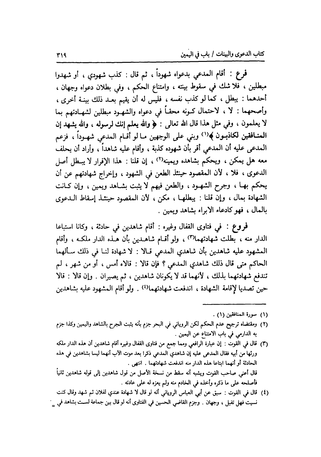 فرع أقام المدعي بدعواه شهودا، ثم قال: كذب شهودي، أو شهدوا مبطلين، فلا شك في سقوط بينته، وامتناع الحكم، وفي بطلان دعواه وجهان، أحدهما: يبطل، كما لو كذب نفسه، فليس له أن يقيم بعد ذلك بينة أخرى، وأصحهما: لا، لاحتمال كونه محقا في دعواه والشهود مبطلين لشهادتهم بما لا يعلمون، وفي مثل هذا قال الله تعالى: * (والله يعلم إنك لرسوله، والله يشهد إن المنافقين لكاذبون) * وبني على الوجهين ما لو أقام المدعي شهودا، فزعم المدعى عليه أن المدعي أقر بأن شهوده كذبة، وأقام عليه شاهدا، وأراد أن يحلف معه هل يمكن، ويحكم بشاهده ويمينه، إن قلنا: هذا الاقرار لا يبطل أصل الدعوى، فلا، لان المقصود حينئذ الطعن في الشهود، وإخراج شهادتهم عن أن يحكم بها، وجرح الشهود، والطعن فيهم لا يثبت بشاهد ويمين، وإن كانت الشهادة بمال، وإن قلنا: يبطلها، مكن، لان المقصود حينئذ إسقاط الدعوى بالمال، فهو كادعاء الابراء بشاهد ويمين. فروع في فتاوى القفال وغيره: أقام شاهدين في حادثة، وكانا استباعا الدار منه، بطلت شهادتهما، ولو أقام شاهدين بأن هذه الدار ملكه، وأقام المشهود عليه شاهدين بأن شاهدي المدعي قالا: لا شهادة لنا في ذلك سألهما الحاكم متى قال ذلك شاهدي المدعي ؟ فإن قالا: قالاه أمس، أو من شهر، لم تندفع شهادتهما بذلك، لانهما قد لا يكونان شاهدين، ثم يصيران. وإن قالا: قالا حين تصديا لاقامة الشهادة، اندفعت شهادتهما. ولو أقام المشهود عليه بشاهدين