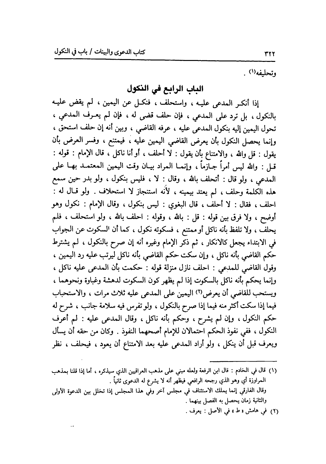 الباب الرابع : في النكول إذا أنكر المدعى عليه، واستحلف، فنكل عن اليمين، لم يقض عليه بالنكول، بل ترد على المدعي، فإن حلف قضى له، فإن لم يعرف المدعى، تحول اليمين إليه بنكول المدعى عليه عرف القاضي، وبين أنه إن حلف استحق، وإنما يحصل النكول بأن يعرض القاضي اليمين عليه، فيمتنع، وفسر العرض بأن يقول: قل والله، والامتناع بأن يقول: لا أحلف، أو أنا ناكل، قال الامام: قوله: قل: والله ليس أمرا جازما، وإنما المراد بيان وقت اليمين المعتمد بها على المدعي، ولو قال: أتحلف بالله، وقال: لا، فليس بنكول، ولو بدر حين سمع هذه الكلمة وحلف، لم يعتد بيمينه، لانه استنجاز لا استحلاف. ولو قال له احلف، فقال: لا أحلف، قال البغوي: ليس بنكول، وقال الامام: نكول وهو أوضح، ولا فرق بين قوله: قل: بالله، وقوله: أحلف بالله، ولو استحلف، فلم يحلف، ولا تلفظ بأنه ناكل أو ممتنع، فسكوته نكول، كما أن السكوت عن الجواب في الابتداء يجعل كالانكار، ثم ذكر الامام وغيره أنه إن صرح بالنكول، لم يشترط حكم القاضي بأنه ناكل، وإن سكت حكم القاضي بأنه ناكل ليرتب عليه رد اليمين، وقول القاضي للمدعي: احلف نازل منزلة قوله: حكمت بأن المدعى عليه ناكل، وإنما يحكم بأنه ناكل بالسكوت إذا لم يظهر كون السكوت لدهشة وغباوة ونحوهما، ويستحب للقاضي أن يعرض اليمين على المدعى عليه ثلاث مرات، والاستحباب فيما إذا سكت أكثر منه فيما إذا صرح بالنكول، ولو تفرس فيه سلامة جانب، شرح له حكم النكول، وإن لم يشرح، وحكم بأنه ناكل، وقال المدعى عليه: لم أعرف النكول، ففي نفوذ الحكم احتمالان للامام أصحهما النفوذ. وكان من حقه أن يسأل ويعرف قبل أن ينكل، ولو أراد المدعى عليه بعد الامتناع أن يعود، فيحلف، نظر