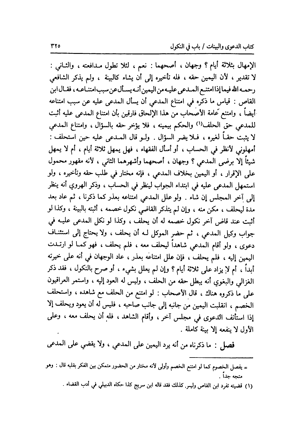 الامهال بثلاثة أيام ؟ وجهان، أصحهما: نعم، لئلا تطول مدافعته، والثاني: لا تقدير، لان اليمين حقه، فله تأخيره إلى أن يشاء كالبينة. ولم يذكر الشافعي رحمه الله فيما إذا امتنع المدعى عليه من اليمين أنه يسأل عن سبب امتناظه، فقال ابن القاص: قياس ما ذكره في امتناع المدعي أن يسأل المدعى عليه عن سبب امتناعه أيضا، وامتنع عامة الاصحاب من هذا الالحاق فارقين بأن امتناع المدعي عليه أثبت للمدعي حق الحلف، والحكم بيمينه، فلا يؤخر حقه بالسؤال، وامتناع المدعي لا يثبت حقا لغيره، فلا يضر السؤال. ولو قال المدعى عليه حين استحلف: أمهلوني لانظر في الحساب، أو أسأل الفقهاء، فهل يمهل ثلاثة أيام، أم لا يمهل شيئا إلا برضى المدعي ؟ وجهان، أصحهما وأشهرهما الثاني، لانه مقهور محمول على الاقرار، أو اليمين بخلاف المدعي، فإنه مختار في طلب حقه وتأخيره، ولو استمهل المدعى عليه في ابتداء الجواب لينظر في الحساب، وذكر الهروي أنه ينظر إلى آخر المجلس إن شاء. ولو علل المدعي امتناعه بعذر كما ذكرنا، ثم عاد بعد مدة ليحلف، مكن منه، وإن لم يتذكر القاضي نكول خصمه، أثبته بالبينة، وكذا لو أثبت عند قاض آخر نكول خصمه له أن يحلف، وكذا لو نكل المدعى عليه في جواب وكيل المدعي، ثم حضر الموكل له أن يحلف، ولا يحتاج إلى استئناف دعوى، ولو أقام المدعي شاهدا ليحلف معه، فلم يحلف، فهو كما لو ارتدت اليمين، إليه، فلم يحلف، فإن علل امتناعه بعذر، عاد الوجهان في أنه على خيرته أبدا، أم لا يزاد على ثلاثة أيام ؟ وإن لم يعلل بشئ، أو صرح بالنكول، فقد ذكر الغزالي والبغوي أنه يبطل حقه من الحلف، وليس له العود إليه، واستمر العراقيون على ما ذكروه هناك، قال الاصحاب: لو امتنع من الحلف مع شاهده، واستحلف الخصم، انقلبت اليمين من جانبه إلى جانب صاحبه، فليس له أن يعود ويحلف إلا إذا استأنف الدعوى في مجلس آخر، وأقام الشاهد، فله أن يحلف معه، وعلى الاول لا ينفعه إلا بينة كاملة. فصل ما ذكرناه من أنه يرد اليمين على المدعي، ولا يقضى على المدعى