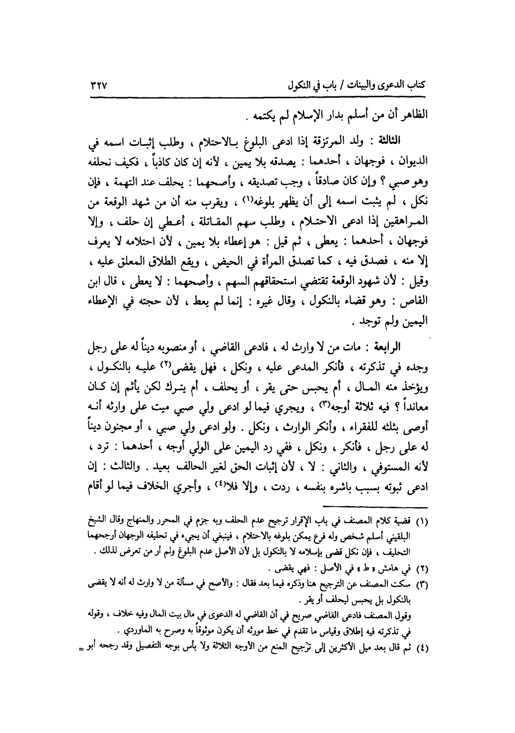 الظاهر أن من أسلم بدار الاسلام لم يكتمه. الثالثة: ولد المرتزقة إذا ادعى البلوغ بالاحتلام، وطلب إثبات اسمه في الديوان، فوجهان، أحدهما: يصدقه بلا يمين، لانه إن كان كاذبا، فكيف نحلفه وهو صبي ؟ وإن كان صادقا، وجب تصديقه، وأصحهما: يحلف عند التهمة، فإن نكل، لم يثبت اسمه إلى أن يظهر بلوغه، ويقرب منه أن من شهد الوقعة من المراهقين إذا ادعى الاحتلام، وطلب سهم المقاتلة، أعطي إن حلف، وإلا فوجهان، أحدهما: يعطى، ثم قيل: هو إعطاء، لان احتلامه لا يعرف إلا منه، فصدق فيه، كما تصدق المرأة في الحيض، ويقع الطلاق المعلق عليه، وقيل: لان شهود الوقعة تقتضي استحقاقهم السهم، وأصحهما: لا يعطى، قال ابن القاص: وهو قضاء بالنكول، وقال غيره: إنما لم يعط، لان حجته في الاعطاء اليمين ولم توجد. الرابعة: مات من لا وارث له، فادعى القاضي، أو منصوبه دينا له على رجل وجده في تذكرته، فأنكر المدعى عليه، ونكل، فهل يقضى عليه بالنكول، ويؤخذ منه المال، أم يحبس حتى يقر، أو يحلف، أم يترك لكن يأثم إن كان معاندا ؟ فيه ثلاثة أوجه، ويجري فيما لو ادعى ولي صبي ميت على وارثه أنه أوصى بثلثه للفقراء، وأنكر الوارث، ونكل. ولو ادعى ولي صبي، أو مجنون دينا له على رجل، فأنكر، ونكل، ففي رد اليمين على الولي أوجه، أحدهما: ترد، لانه المستوفي، والثاني: لا، لان إثبات الحق لغير الحالف بعيد. والثالث: إن ادعى ثبوته بسبب باشره بنفسه، ردت، وإلا فلا، وأجري الخلاف فيما لو أقام