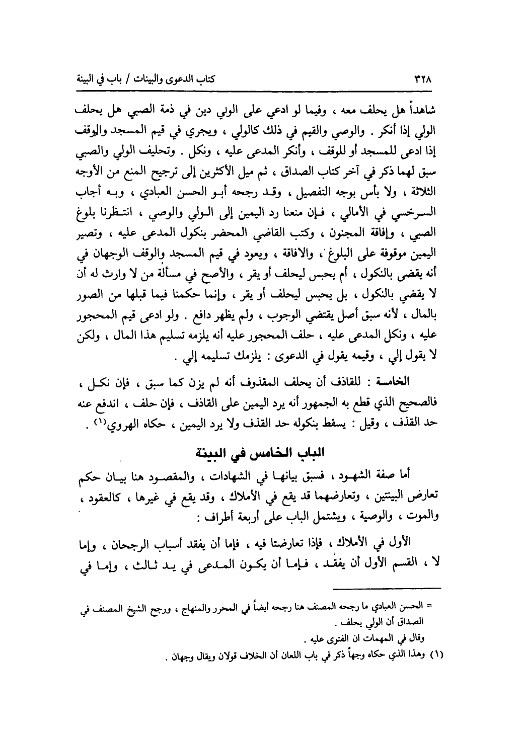 شاهدا هل يحلف معه، وفيما لو ادعي على الولي دين في ذمة الصبي هل يحلف الولي إذا أنكر. والوصي والقيم في ذلك كالولي، ويجري في قيم المسجد والوقف إذا ادعى للمسجد أو للوقف، وأنكر المدعى عليه، ونكل. وتحليف الولي والصبي سبق لهما ذكر في آخر كتاب الصداق، ثم ميل الاكثرين إلى ترجيح المنع من الاوجه الثلاثة، ولا بأس بوجه التفصيل، وقد رجحه أبو الحسن العبادي، وبه أجاب السرخسي في الامالي، فإن منعنا رد اليمين إلى الولي والوصي، انتظرنا بلوغ الصبي، وإفاقة المجنون، وكتب القاضي المحضر بنكول المدعى عليه، وتصير اليمين موقوفة على البلوغ، والافاقة، ويعود في قيم المسجد والوقف الوجهان في أنه يقضى لا بالنكول، أم يحبس ليحلف أو يقر، والاصح في مسألة من لا وارث له أن يقضى بالنكول، بل يحبس ليحلف أو يقر، وإنما حكمنا فيما قبلها من الصور بالمال، لانه سبق أصل يقتضي الوجوب، ولم يظهر دافع. ولو ادعى قيم المحجور عليه، ونكل المدعى عليه، حلف المحجور عليه أنه يلزمه تسليم هذا المال، ولكن لا يقول إلي، وقيمه يقول في الدعوى: يلزمك تسليمه إلي. الخامسة: للقاذف أن يحلف المقذوف أنه لم يزن كما سبق، فإن نكل، فالصحيح الذي قطع به الجمهور أنه يرد اليمين على القاذف، فإن حلف، اندفع عنه حد القذف، وقيل: يسقط بنكوله حد القذف ولا يرد اليمين، حكاه الهروي.