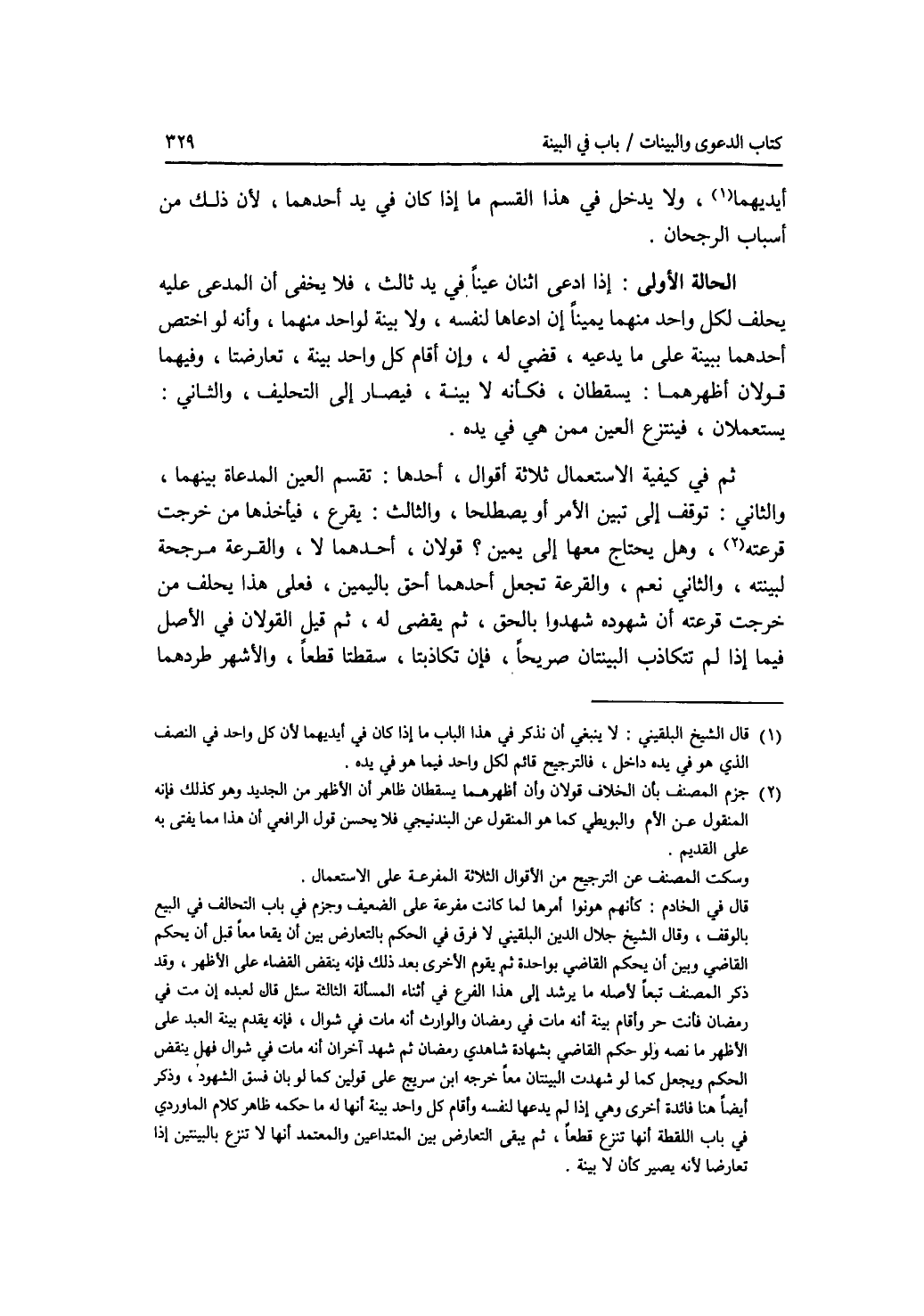 أيديهما، ولا يدخل في هذا القسم ما إذا كان في يد أحدهما، لان ذلك من أسباب الرجحان. الحالة الاولى: إذا ادعى اثنان عينا في يد ثالث، فلا يخفى أن المدعى عليه يحلف لكل واحد منهما يمينا إن ادعاها لنفسه، ولا بينة لواحد منهما، وأنه لو اختص أحدهما ببينة على ما يدعيه، قضي له، وإن أقام كل واحد بينة، تعارضتا، وفيهما قولان أظهرهما: يسقطان، فكأنه لابينة فيصار إلى التحليف، والثاني: يستعملان، فينتزع العين ممن هي في يده. ثم في كيفية الاستعمال ثلاثة أقوال، أحدها: تقسم العين المدعاة بينهما، والثاني: توقف إلى تبين الامر أو يصطلحا، والثالث: يقرع، فيأخذها من خرجت قرعته، وهل يحتاج معها إلى يمين ؟ قولان، أحدهما لا، والقرعة مرجحة لبينته، والثاني نعم، والقرعة تجعل أحدهما أحق باليمين، فعلى هذا يحلف من خرجت قرعته أن شهوده شهدوا بالحق، ثم يقضي له، ثم قيل القولان في الاصل فيما إذا لم تتكاذب البينتان صريحا، فإن تكاذبتا، سقطتا قطعا، والاشهر طردهما