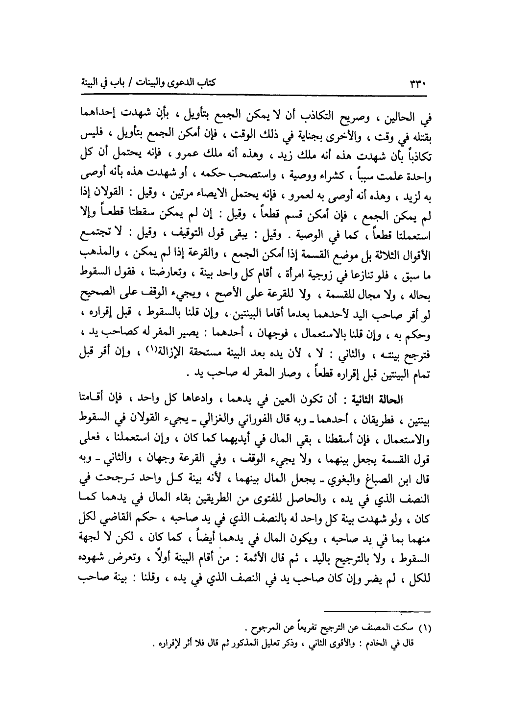 في الحالين، وصريح التكاذب أن لا يمكن الجمع بتأويل، بأن شهدت إحداهما بقتله في وقت، والاخرى بجناية في ذلك الوقت، فإن أمكن الجمع بتأويل، فليس تكاذبا بأن شهدت هذه أنه ملك زيد، وهذه أنه ملك عمرو، فإنه يحتمل أن كل واحدة علمت سببا، كشراء ووصية، واستصحب حكمه، أو شهدت هذه بأنه أوصى به لزيد، وهذه أنه أوصى به لعمرو، فإنه يحتمل الايصاء مرتين، وقيل: القولان إذا لم يمكن الجمع، فإن أمكن قسم قطعا، وقيل: إن لم يمكن سقطتا قطعا وإلا استعملتا قطعا، كما في الوصية وقيل: يبقى قول التوقيف، وقيل: لا تجتمع الاقوال الثلاثة بل موضع القسمة إذا أمكن الجمع، والقرعة إذا لم يمكن، والمذهب ما سبق، فلو تنازعا في زوجية امرأة، أقام كل واحد بينة، وتعارضتا، فقول السقوط بحاله، ولا مجال للقسمة، ولا للقرعة على الاصح، ويجئ الوقف على الصحيح لو أقر صاحب اليد لاحدهما بعدما أقاما البينتين، إن قلنا بالسقوط، قبل إقراره، وحكم به، وإن قلنا بالاستعمال، فوجهان، أحدهما: يصير المقر له كصاحب يد، فترجح بينته، والثاني: لا، لان يده بعد البينة مستحقة الازالة، وإن أقر قبل تمام البينتين قبل إقراره قطعا، وصار المقر له صاحب يد. الحالة الثانية: أن تكون العين في يدهما وادعاها كل واحد، فإن أقامتا بينتين، فطريقان، أحدهما - وبه قال الفوراني والغزالي - يجئ القولان في السقوط والاستعمال، فإن أسقطنا، بقي المال في أيديهما كما كان، وإاستعملنا، فعلى قول القسمة يجعل بينهما، ولا يجئ الوقف، وفي القرعة وجهان، والثاني - وبه قال ابن الصباغ والبغوي - يجعل المال بينهما، لان بينة كل واحد ترجحت في النصف الذي في يده، والحاصل للفتوى من الطريقين بقاء المال في يدهما كما كان، ولو شهدت بينة كل واحد له بالنصف الذي في يد صاحبه، حكم القاضي لكل منهما بما في يد صاحبه، ويكون المال في يدهما أيضا، كما كان، لكن لا لجهة السقوط، ولا بالترجيح باليد، ثم قال الائمة: من أقام البينة أولا، وتعرض شهوده للكل، لم يضر وإن كان صاحب يد في النصف الذي في يده، وقلنا: بينة صاحب