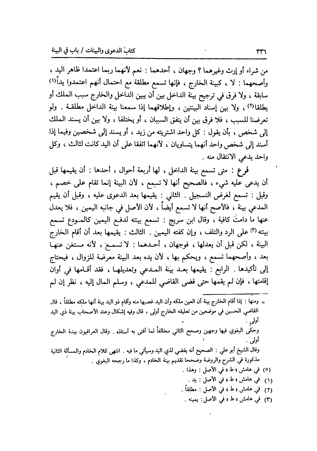 من شراء أو إرث وغيرهما ؟ وجهان، أحدهما: نعم لانهما ربما اعتمدا ظاهر اليد، وأصحهما: لا، كبينة الخارج، فإنها تسمع مطلقة مع احتمال أنهم اعتمدوا يدا سابقة، ولا فرق في ترجيح بينة الداخل بين أن يبين الداخل والخارج سبب الملك أو يطلقا، ولا بين إسناد البينتين، وإطلاقهما إذا سمعنا بينة الداخل مطلقة. ولو تعرضنا للسبب، فلا فرق بين أن يتفق السببان، أو يختلفا، ولا بين أن يسند الملك إلى شخص، بأن يقول: كل واحد اشتريته من زيد، أو يسند إلى شخصين وفيما إذا أسند إلى شخص واحد أنهما يتساويان، لانهما اتفقا على أن اليد كانت لثالث، وكل واحد يدعي الانتقال منه. فرع متى تسمع بينة الداخل، لها أربعة أحوال، أحدها: أن يقيمها قبل أن يدعى عليه شئ، فالصحيح أنها لا تسمع، لان البينة إنما تقام على خصم، وقيل: تسمع لغرض التسجيل. الثاني: يقيمها بعد الدعوى عليه، وقبل أن يقيم المدعي بينة، فالاصح أنها لا تسمع أيضا، لان الاصل في جانبه اليمين، فلا يعدل عنها ما دامت كافية، وقال ابن سريج: تسمع بينته لدفع اليمين كالمودع تسمع بينته على الرد والتلف، وإن كفته اليمين. الثالث: يقيمها بعد أن أقام الخارج البينة، لكن قبل أن يعدلها، فوجهان، أحدهما: لا تسمع، لانه مستغن عنها بعد، وأصحهما تسمع، ويحكم بها، لان يده بعد البينة معرضة للزوال، فيحتاج إلى تأكيدها. الرابع: يقيمها بعد بينة المدعي وتعديلها، فقد أقامها في أوان إقامتها، فإن لم يقمها حتى قضى القاضي للمدعي، وسلم المال إليه، نظر إن لم